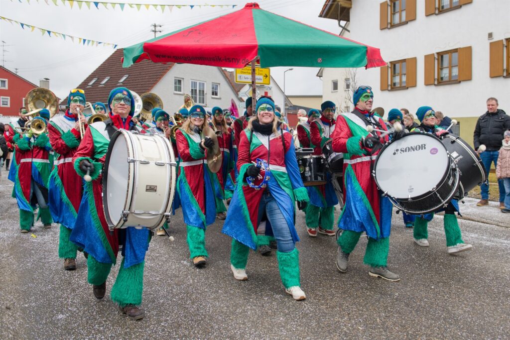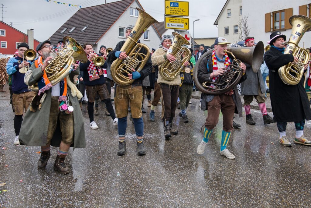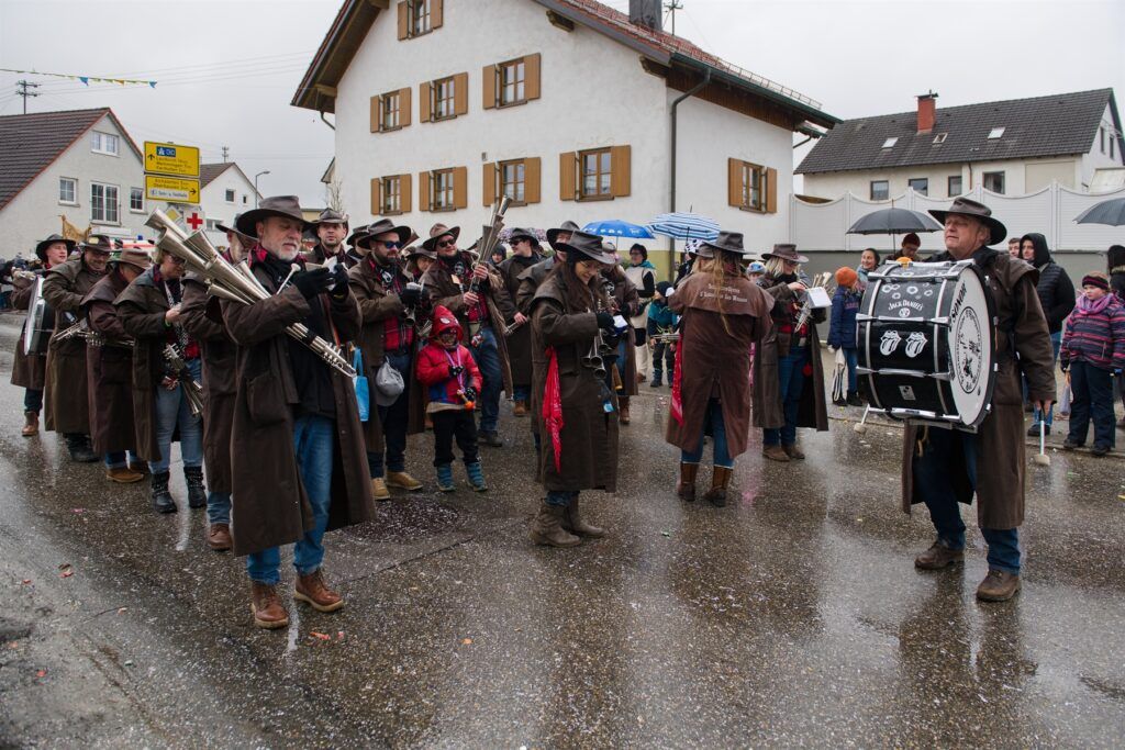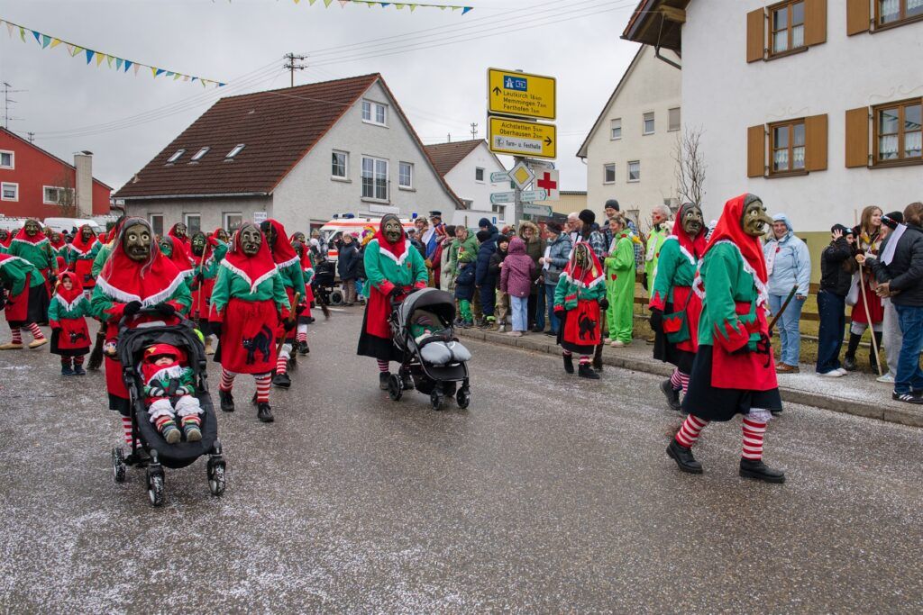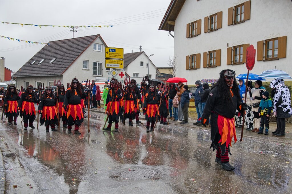 Aitrach – Getreu dem diesjährigen Motto der Aitracher Fasnet „Auf dem Bauernhof“ präsentierten sich am Samstag viele Fußgruppen der heimischen Narrenzunft beim traditionellen Narrensprung in der Illertalgemeinde. Mehr als 3000 Mitwirkende in 75 Gruppen sorgten für Hochstimmung beim zweistündigen Umzug. Hästräger von 35 Narrenzünften der alemannischen Fasnet, dem bayerischen Fasching, Prinzenpaare und Gardemädchen, Lumpenkapellen, Fanfarenzüge, Schalmeien und Blaskapellen begeisterten die zahlreichen Besucher.