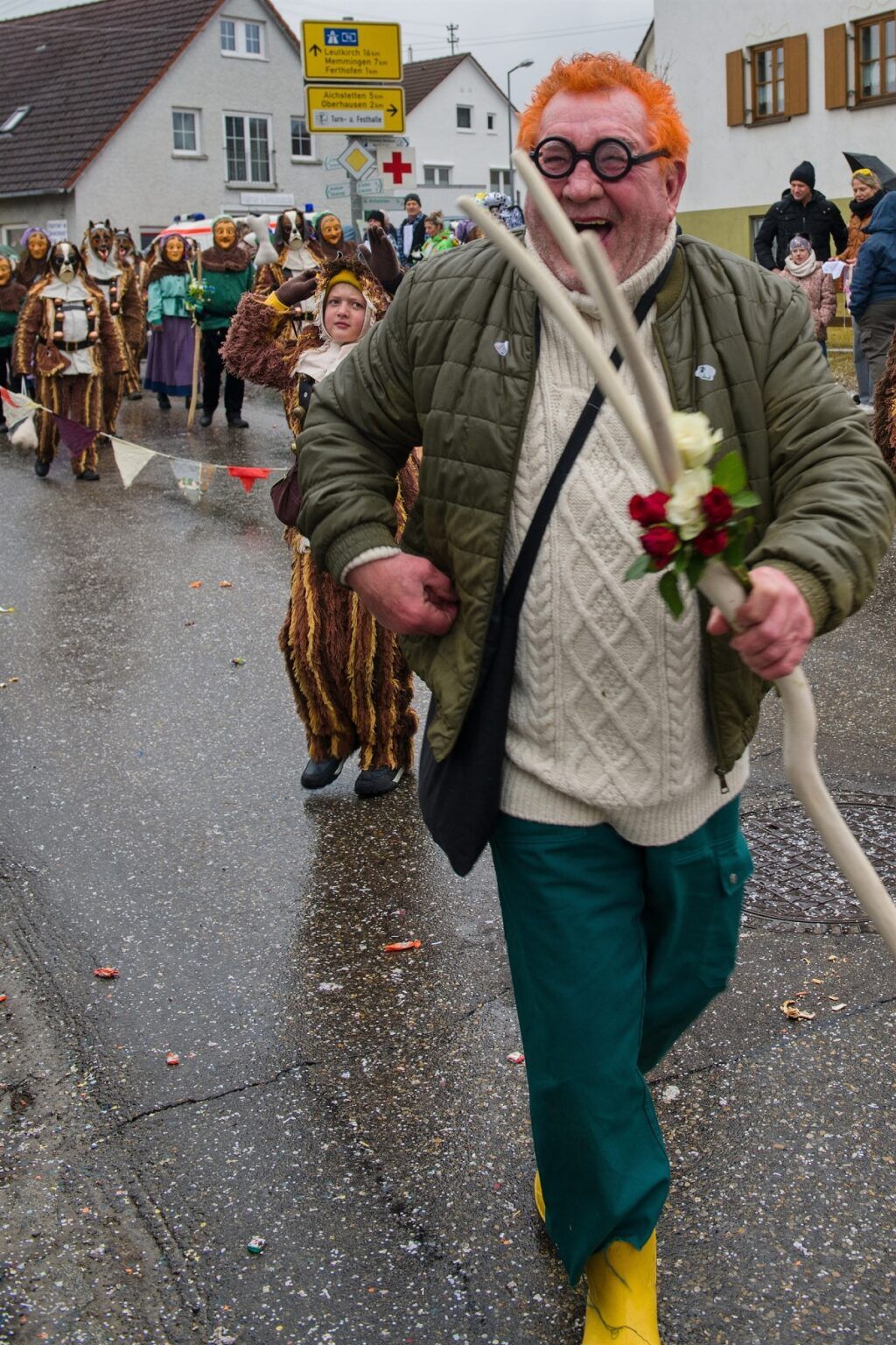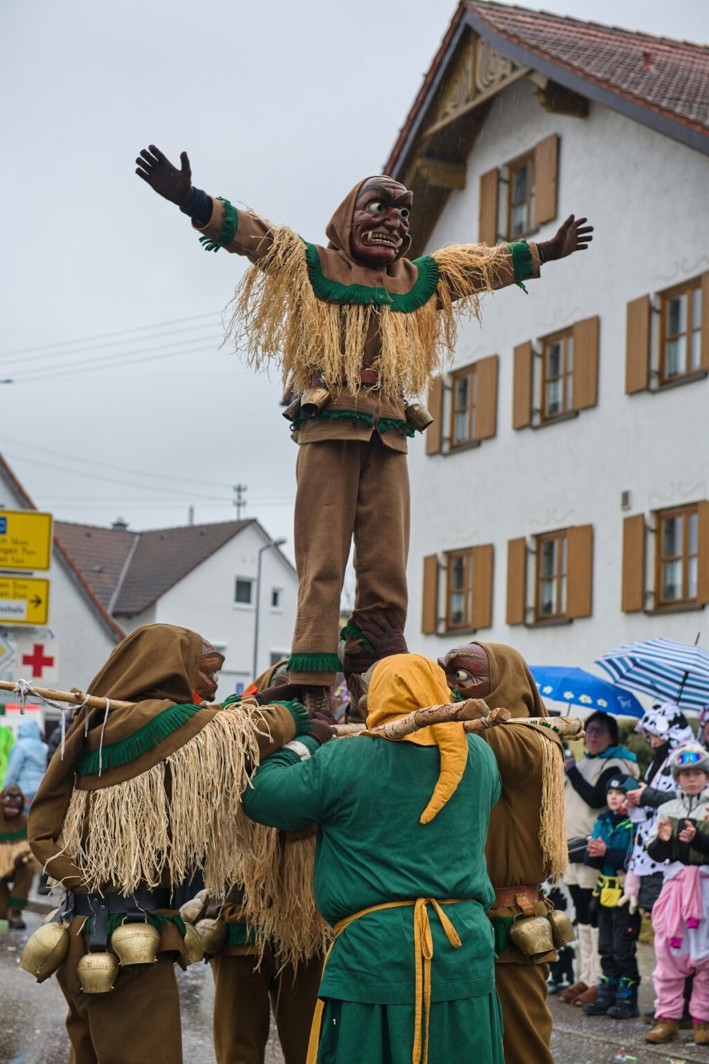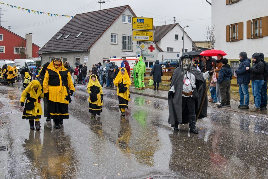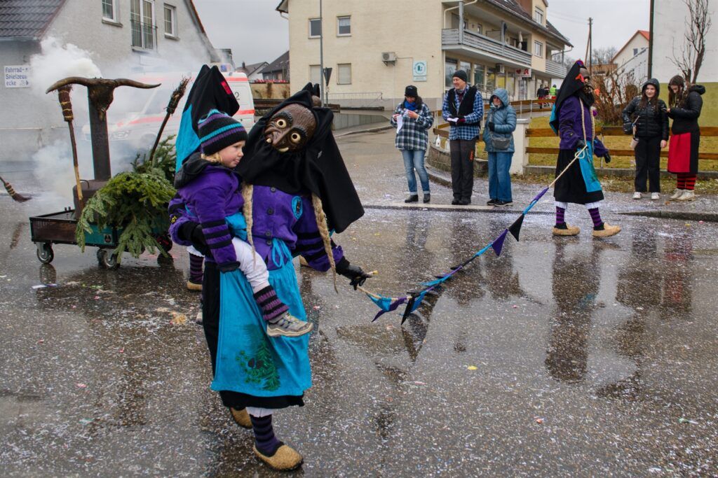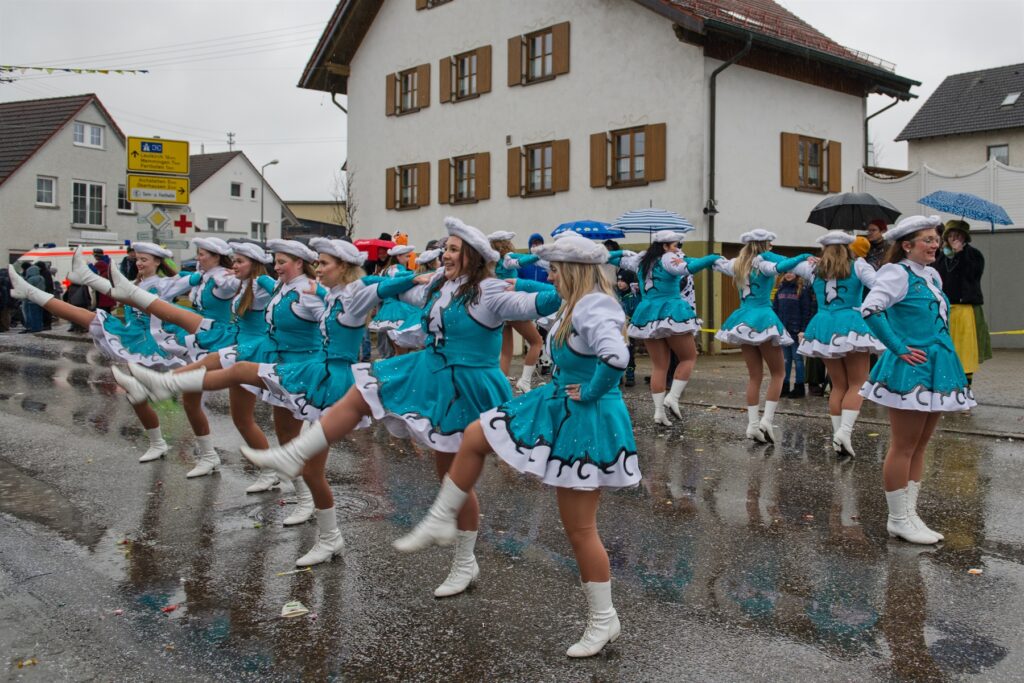 Ein großes Kompliment gilt allen Maskenträgern und Gruppen für das disziplinierte Verhalten während des Umzuges bei solchen Witterungsverhältnissen – das gilt besonders für die Gardemädchen, die trotz leichter Bekleidung ihre Tänze zeigten, aber auch für die Hexen, die trotz Nässe und Kälte ihre Pyramiden bauten.