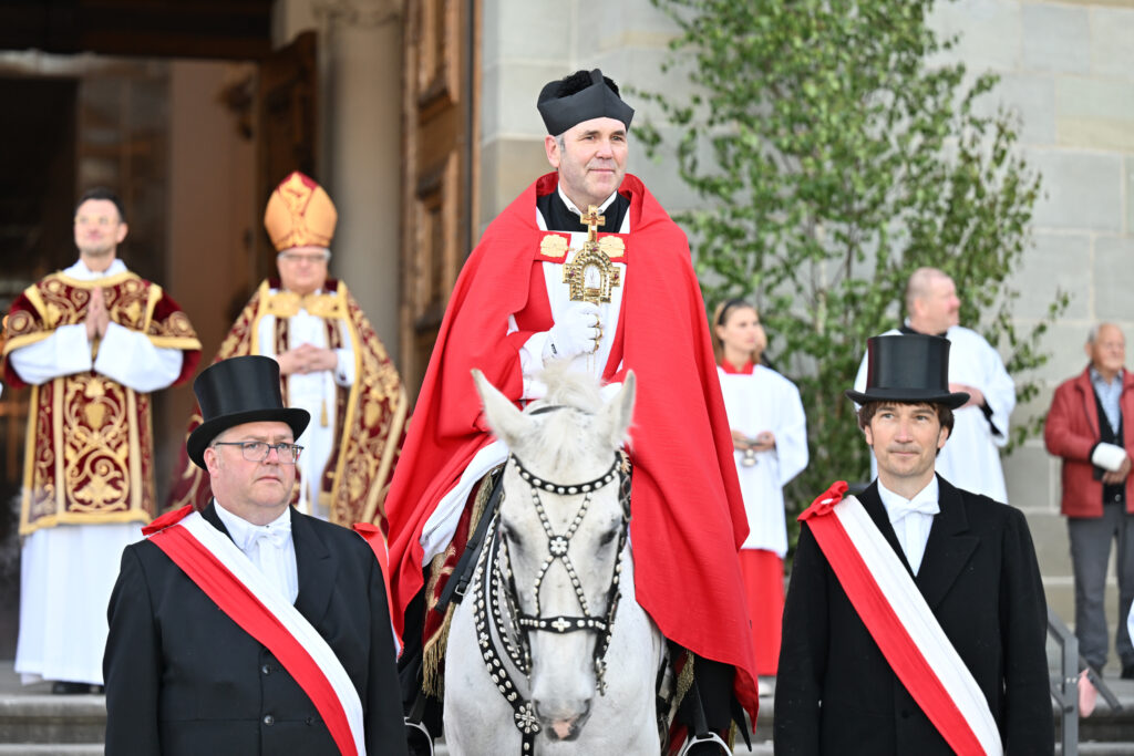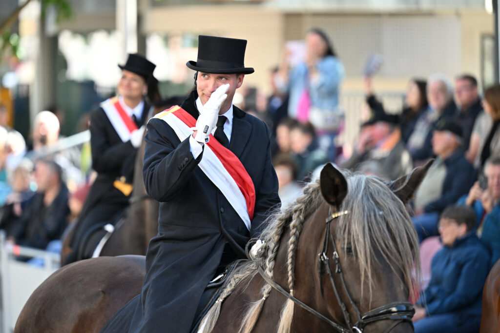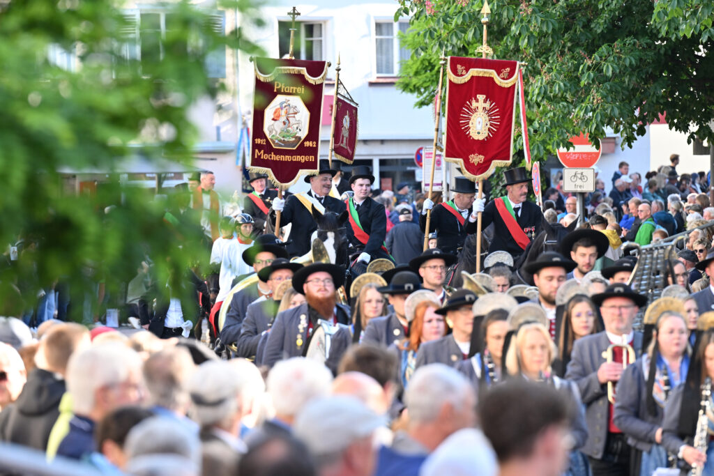 Weingarten – Genau 1841 Reiterinnen und Reiter zogen am Freitag (29.5.) bei strahlendem Sonnenschein zu Ehren des Heiligen Blutes durch Weingarten und die umliegenden Fluren. In der Stadt begleiteten Hunderte Musikerinnen und Musiker die 96 Blutreitergruppen, und Tausende Gläubige, Besucherinnen und Besucher säumten die Straßen. Der diesjährige kirchliche Festgast, Bischof Dr. Karl-Heinz Wiesemann aus Speyer, verfolgte den Blutritt vom Balkon des Rathauses aus, während der baden-württembergische CDU-Landesvorsitzende Manuel Hagel, Ehrengast auch er, hoch zu Ross teilnahm. Als weiterer Ehrengast erlebte Ministerpräsident Winfried Kretschmann die Prozession ebenfalls vom Rathaus aus mit. Überschattet wurde das Fest von einem Pferdeunfall: Zwei Reiter stürzten vom Pferd, einer verletzte sich erheblich.
