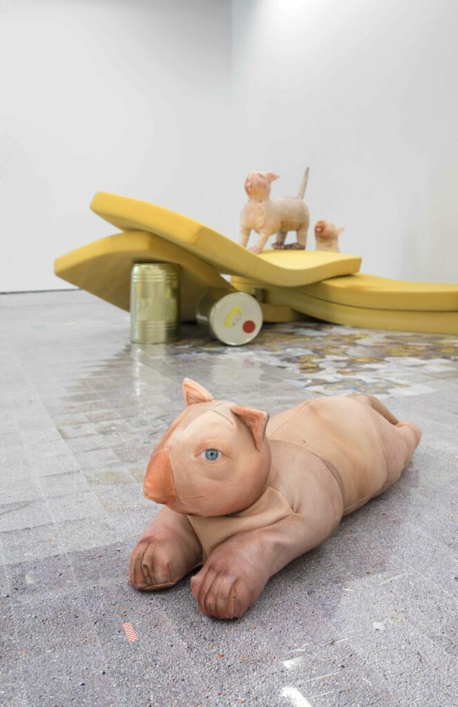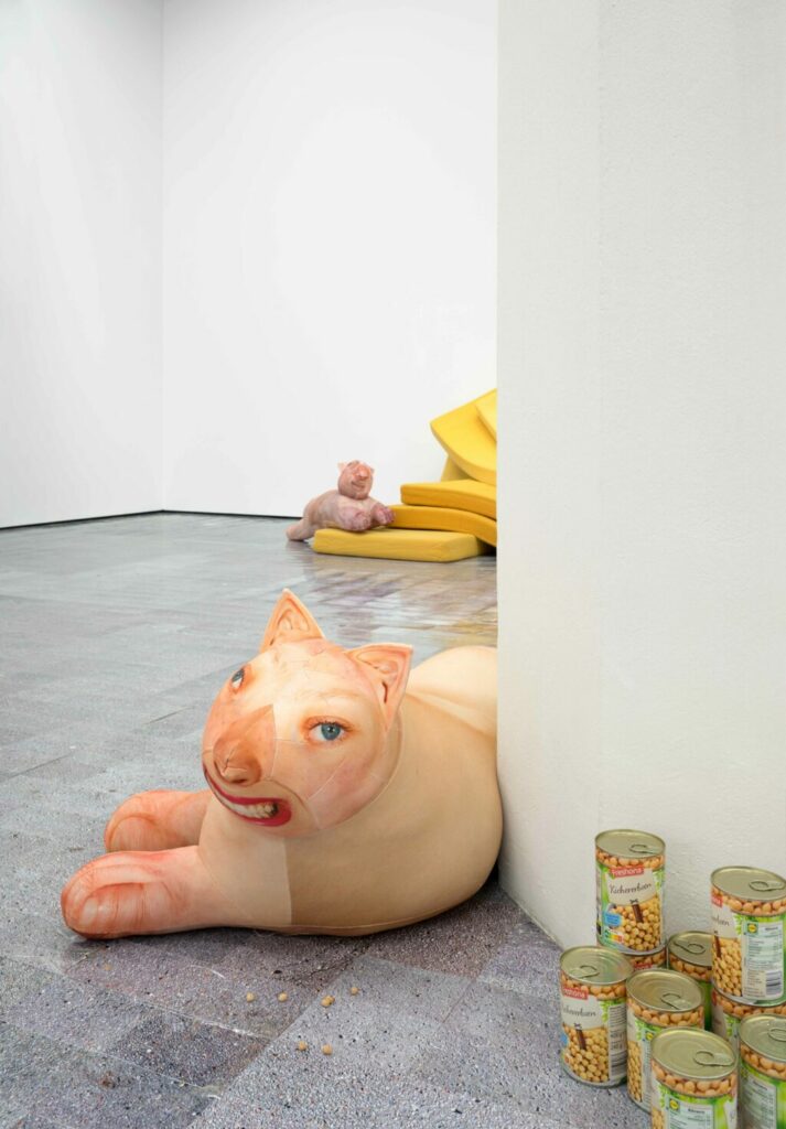 Lea Gocht ist Installationskünstlerin und beschäftigt sich in ihrer Arbeit mit Themen aus Soziologie, Psychologie und Klimaforschung. Seit 2024 arbeitet die Künstlerin an einer fortlaufenden Installationsreihe mit dem Titel „anhedonia“. Dieser Begriff bezeichnet den Verlust der Fähigkeit, Freude zu empfinden – Lea Gocht weitet den Begriff aus auf kollektive Erfahrungen wie Ohnmacht, Kontrollverlust und das Streben nach Handlungsfähigkeit, die als Reaktion auf gesellschaftliche Krisen entstehen. Die in der Sparkassengalerie gezeigten Katzenwesen sind eine Fortsetzung der Installation „anhedonia II“, die 2025 im Kunstmuseum Karlsruhe gezeigt wurde.