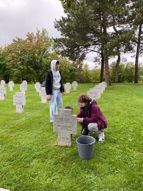 Die Kriegsgräberstätte Bergheim ist ein Sammelfriedhof mit rund 5309 Kriegstoten aus 225 elsässischen Gemeinden. Viele von ihnen starben im Winter 1944/45. Trotz widriger herbstlicher Wetterbedingungen zeigten sich die Auszubildenden aus dem zweiten und dritten Ausbildungsjahr hoch motiviert. „Sie helfen uns – das ist sehr wichtig für uns“, sagte Manon Ehrhardt, die vor Ort für über 50 Kriegsgräberstätten verantwortlich ist.