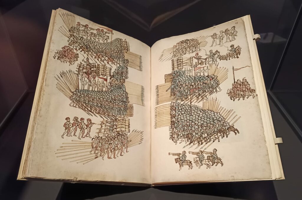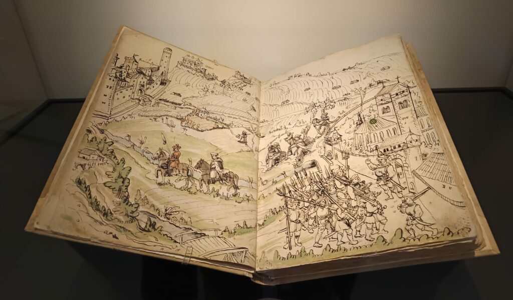 Ebenfalls in einer Vitrine wird selbstverständlich auch das wertvolle Hauptstück der Ausstellung präsentiert. Der „Weißenauer Chronik“ – damals in der Region entstanden und bis heute hier aufbewahrt, nämlich im Archiv von Schloss Zeil – ist ein ganzer Raum gewidmet. In ihr hat der Weißenauer Abt Jakob Murer die Auseinandersetzungen rund um sein Kloster festgehalten. Die elf Federzeichnungen sind ein regelrechtes Bilderbuch des Bauernkrieges, in dem die Ereignisse wie in einem spannenden Comic erzählt werden. Die Bilder aus der Chronik werden auf eine große Leinwand projiziert. Man kann sie aber auch in aller Ruhe auf einem Touchscreen mit vielen Erläuterungen durchblättern.