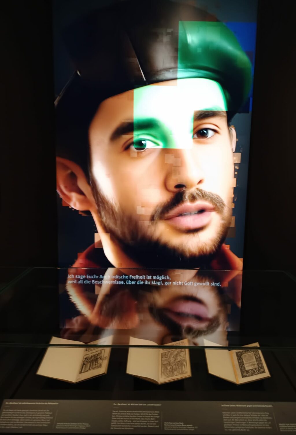 Im ersten Raum der Ausstellung treten die Acht erstmals auf. Dort ist man dann aber doch etwas überrascht. Dieser blondgelockte Jüngling im silbernen Hemd: Das soll der Maler Jerg Ratgeb sein, den die Bauern zum Kanzler wählten und der deswegen später gevierteilt wurde? Oder der perfekt gestylte Schönling mit dem vielen Bling-Bling am Körper: Das ist Georg Truchsess von Waldburg, der Bauernjörg, der als Heerführer des Schwäbischen Bundes die Aufständischen gnadenlos niederringen sollte? Eher hätte man vermutet, die beiden seien vom Eurovision Song Contest in Basel ausgeliehen worden. Aber vielleicht hilft eine solche Aktualisierung ja tatsächlich, die Thematik der Schau einer jüngeren Generation näherzubringen. Die KI-Persönlichkeiten werden dem Besucher nun in vielen Räumen begegnen und dort ihre Sicht der Dinge erläutern.