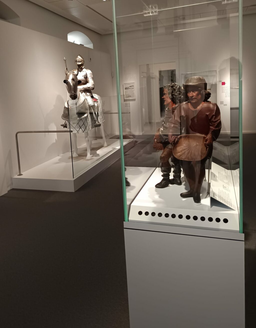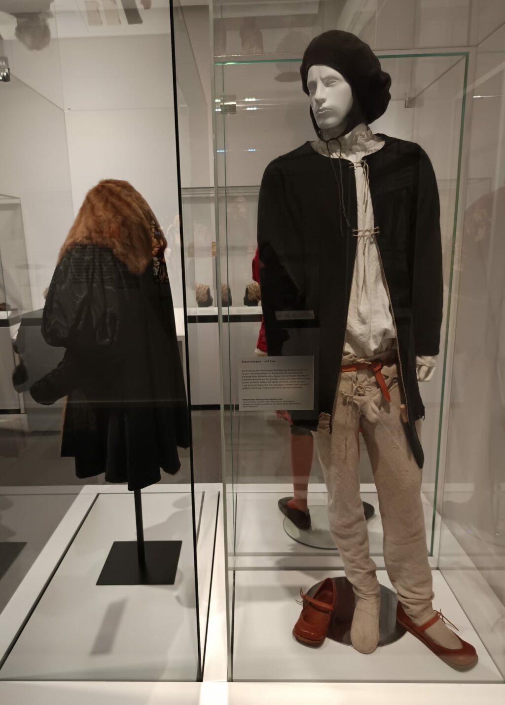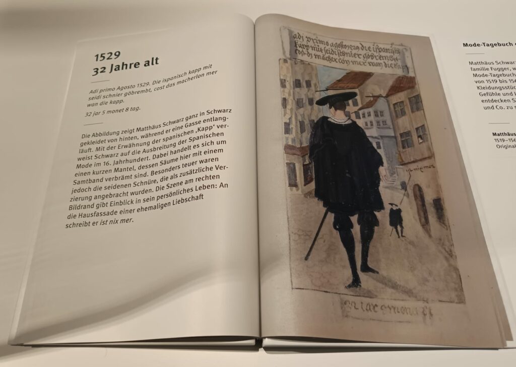 In der opulenten Schau erwarten den Besucher viele spannende Ausstellungsstücke. Dazwischen findet sich auch immer wieder ausgesprochen Spektakuläres, das die Blicke besonders auf sich zieht, so zum Beispiel eine prächtige Ritterrüstung für Ross und Reiter. Gleich gegenüber verlockt ein großformatiges Gemälde, die Landtafel des Donautals bei Riedlingen, regelrecht zum ausführlichen „Spazierengucken“ zwischen Dörfern und Wäldern. Überall lassen sich dort Szenen aus dem Alltagsleben der Landbevölkerung entdecken. Genauso sind die ausgestellten historischen Kleidungsstücke aus der Zeit wirkliche Hingucker. Auch im Gegensatz zwischen den prächtigen Gewändern der städtischen Oberschicht und den einfachen Kleidern der Bauern werden die gesellschaftlichen Gegensätze der Epoche schlagartig greifbar. Gleich daneben sollte man ein kurioses Faksimile nicht übersehen, das zum Durchblättern bereit liegt. Ein offensichtlich mode-verrückter Angestellter der Fugger hat dort festgehalten, welche tollen Outfits er über die Jahre getragen hat.