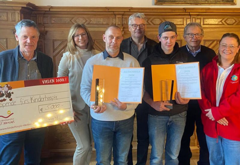 Isny – Eine Baustelle in Wangen. Ein 17-jähriger Zimmermann merkt Feuer im Nachbargebäude. Er registriert, dass in dessen Obergeschoss noch Kinder sind. Der 17-jährige rennt rauf und holt die Kinder aus der Gefahr. Bastian Prinz heißt dieser Lebensretter. Am Freitagnachmittag (30. Januar) wurde er dafür von der Thomas-Fritz-Heldenstiftung im Historischen Sitzungssaal des Rathauses Isny geehrt. Ebenso Jens Fischer. Der hatte sich in Isny mit seinem Radlader einem Amokfahrer in den Weg gestellt.