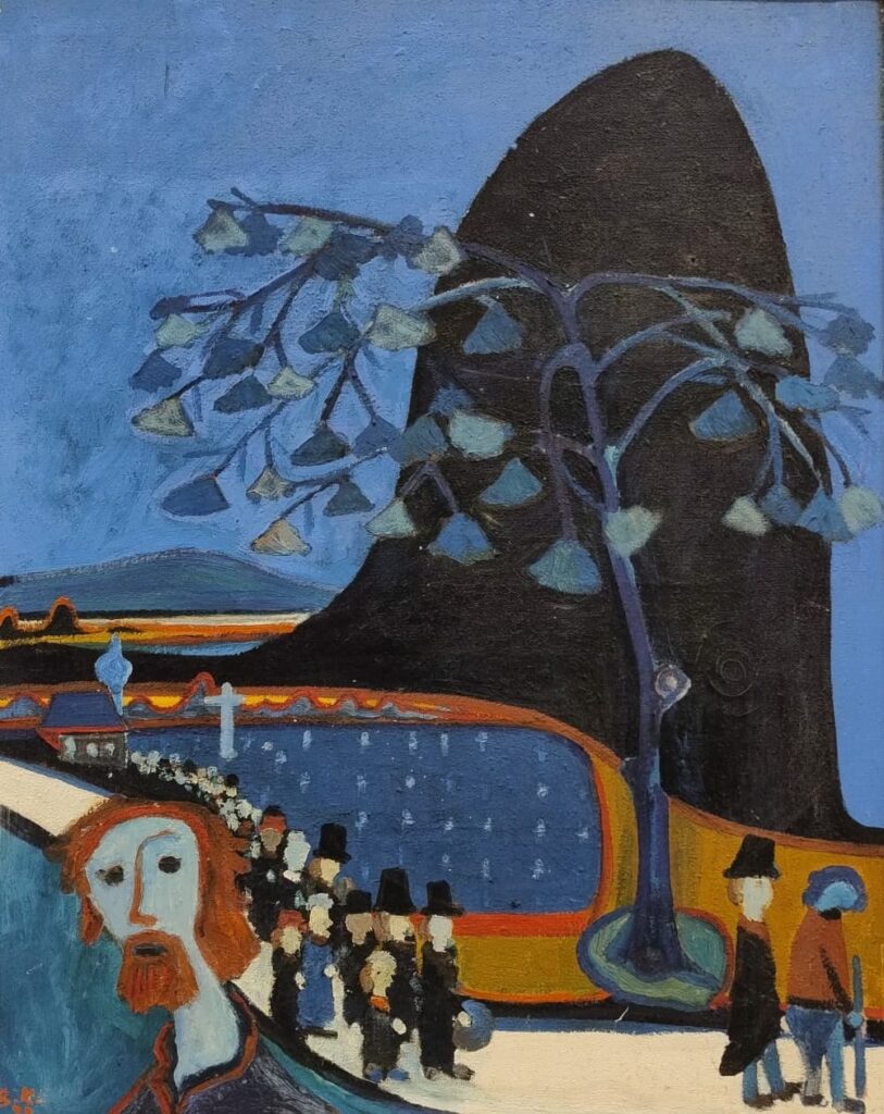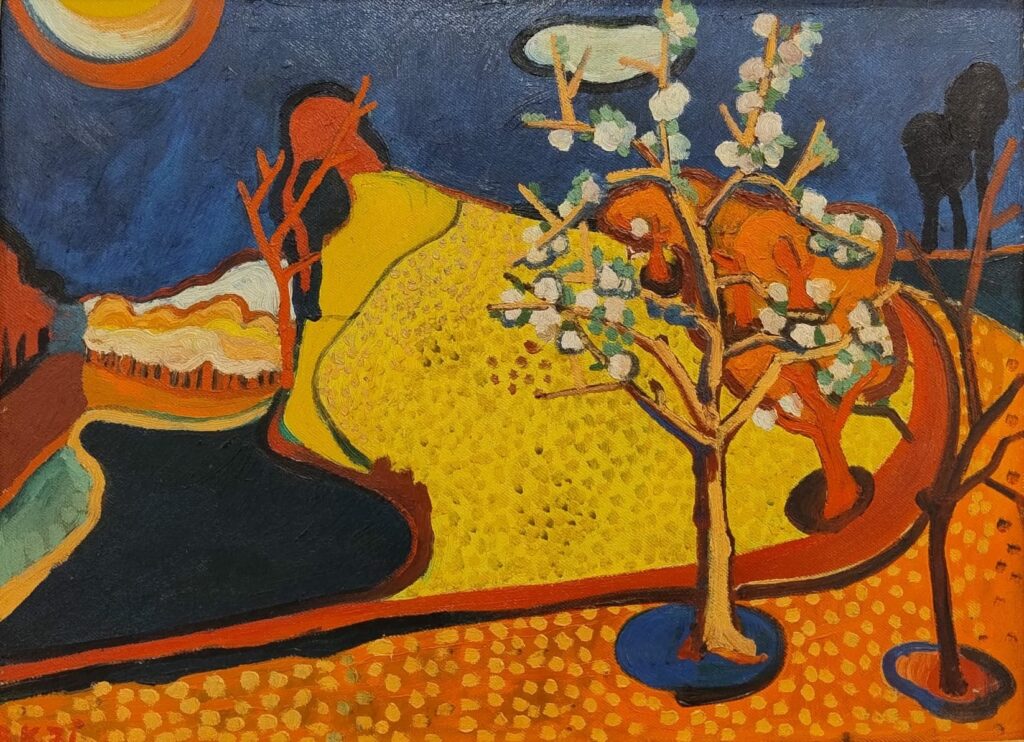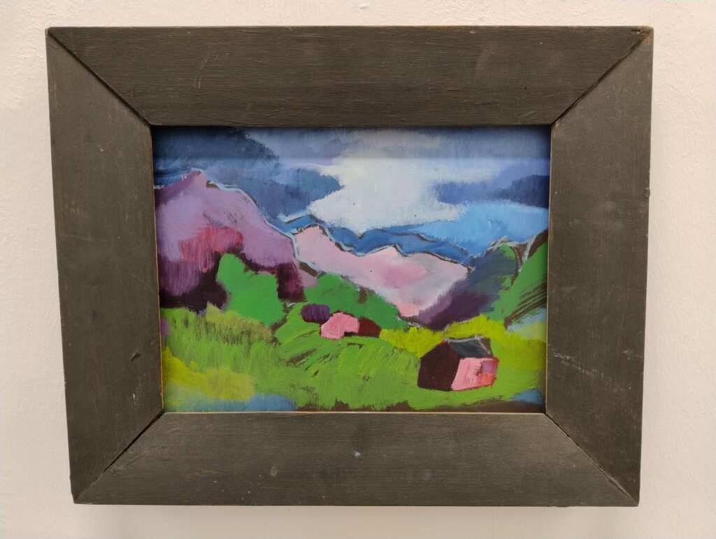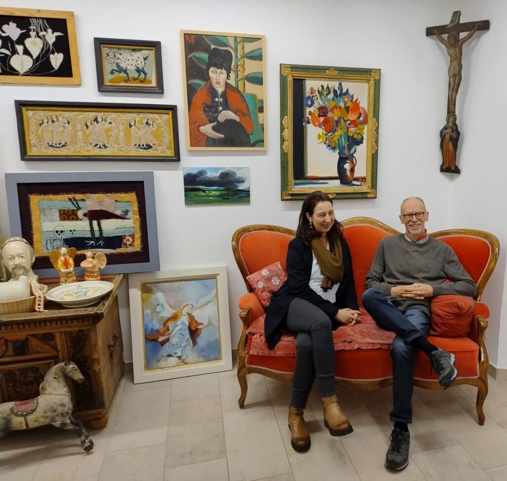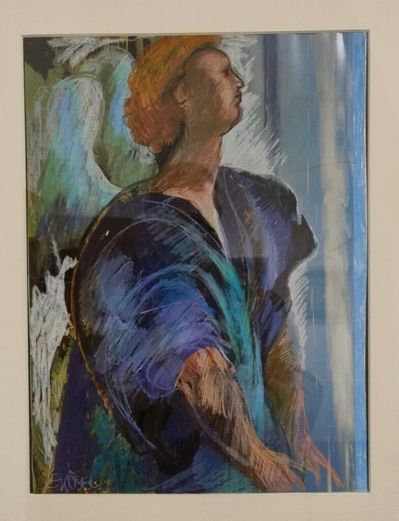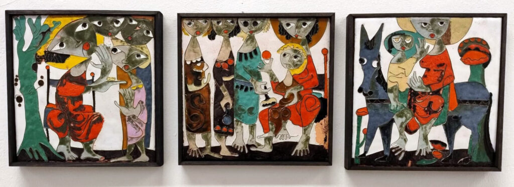 Edith Kösel (1941-2019) arbeitet auch später viel mit Textilien, oft in ganz freien Techniken, wie etwa in einigen ihrer unkonventionellen Engeldarstellungen aus den 1990er-Jahren. Daneben entsteht auch viel Keramik. Außerdem ist sie eine geschätzte und vielbeschäftigte Porträtmalerin. Ihre Porträts der Kinder sind denn auch ein Höhepunkt der Ausstellung. Berthold Kösel (1934-2021) ist vielen Sigmaringern noch in Erinnerung, wie er mit seinem vom Esel gezogenen Karren ins Donautal wandert, um dort zu malen. Das Ergebnis sind strahlend farbstarke Landschaftsbilder, die an den großen Aufbruch der Malerei zu Beginn des 20. Jahrhunderts, etwa bei den französischen Fauves oder bei den deutschen Expressionisten, anknüpfen. Aber unter Berthold Kösels Händen entstehen auch Glasfenster und Tonskulpturen. Darüber hinaus baut er für Familie und Freunde – oft in Zusammenarbeit mit Frau und Kindern – über 20, individuell gestaltete Kachelöfen. Dass Tobias, der 1968 geborene Sohn, schließlich das Ofensetzerhandwerk erlernt, ist vor diesem Hintergrund kaum ein Zufall.