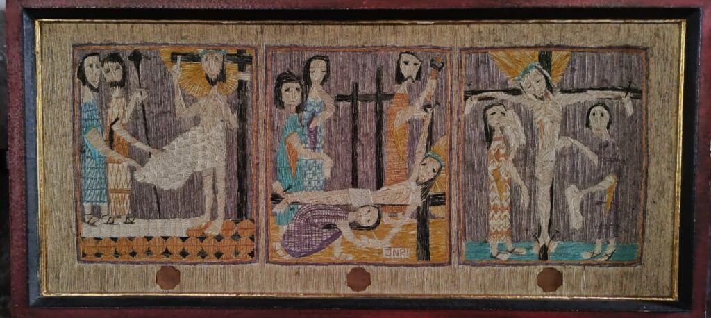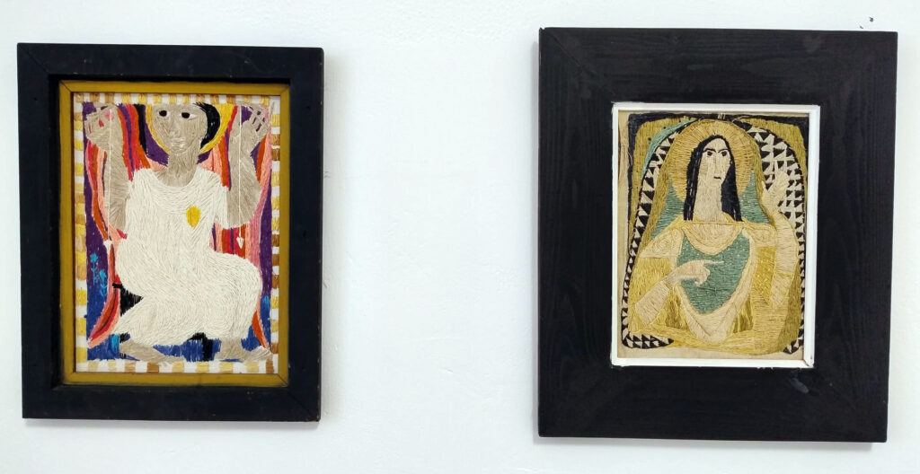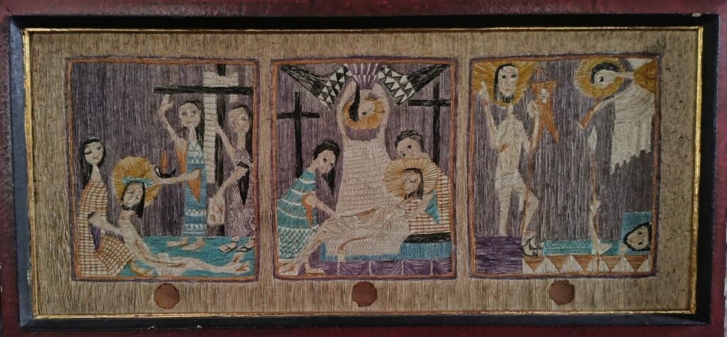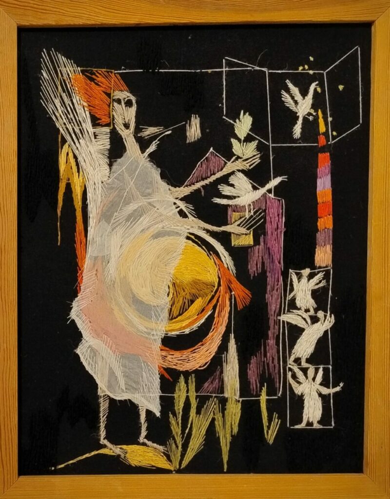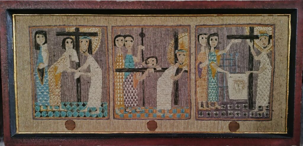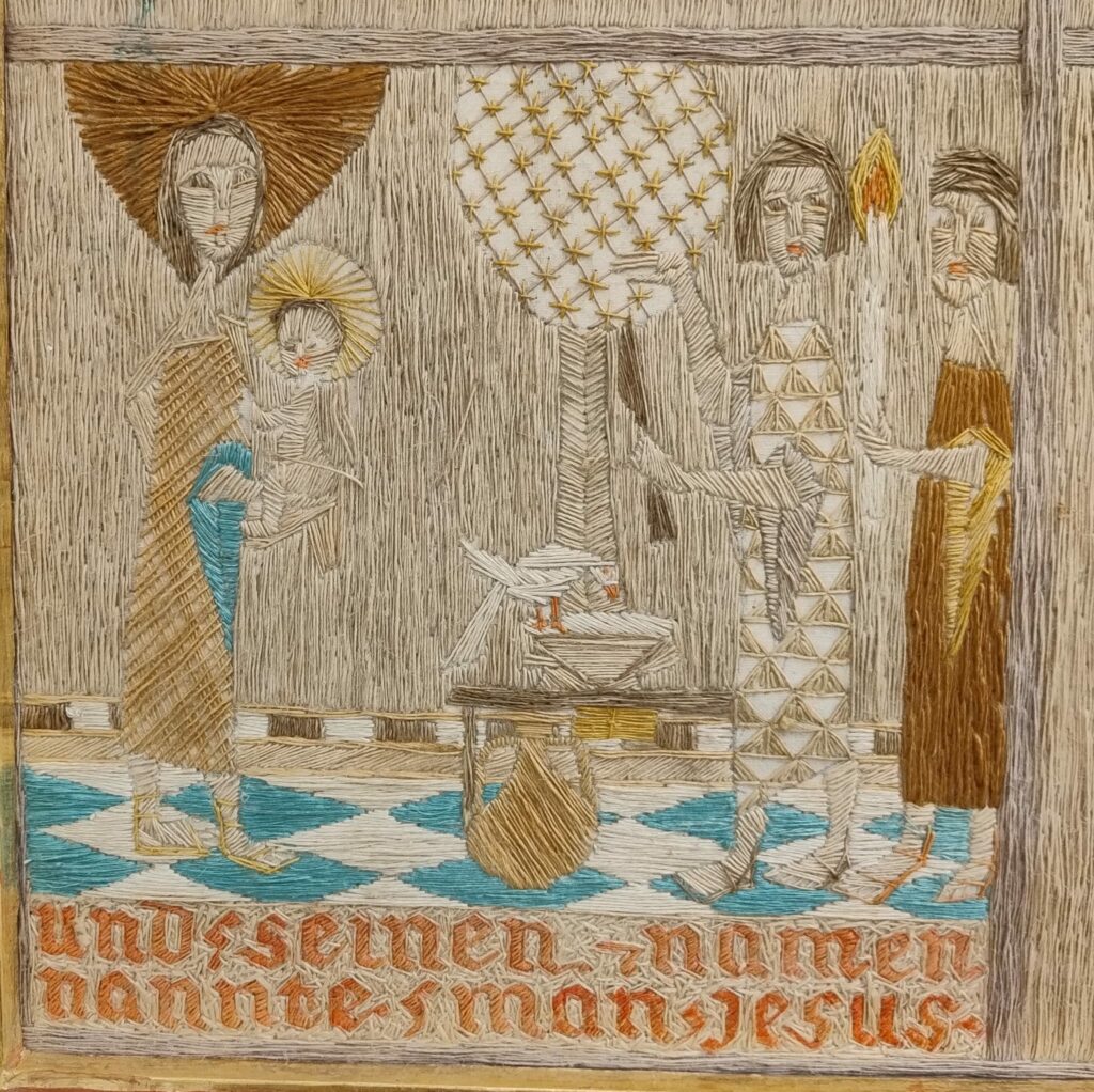 Als Gemeinschaftsarbeiten der beiden tief gläubigen Eltern entsteht in diesen frühen Jahren Außergewöhnliches: Szenen aus dem Alten und Neuen Testament als aufwändige Stickereien mit gefärbtem Hanfgarn. Als der Pfarrer der Sigmaringer Fidelis-Gemeinde 1963 zum Taufgespräch ins Haus kommt, erwirbt er für seine eben erst fertiggestellte Kirche spontan einen Teppich mit den Rosenkranzgeheimnissen. Bald gibt die Pfarrgemeinde neue Ausstattungsstücke für St. Fidels in Auftrag, so etwa eine Madonna aus Terracotta und einen ebenfalls gestickten Kreuzweg. Die Saulgauer Ausstellung beginnt mit einigen Beispielen aus dieser Werkgruppe. Arbeiten wie etwa „Brennender Dornbusch“ bleiben stilistisch in der Schwebe zwischen einer heiteren, naïven Tonlage und einer Strenge, die an die Malerei der Romanik erinnert.