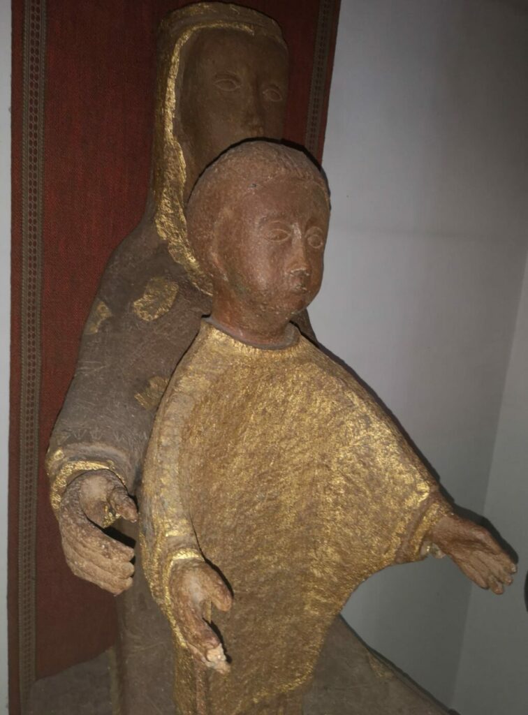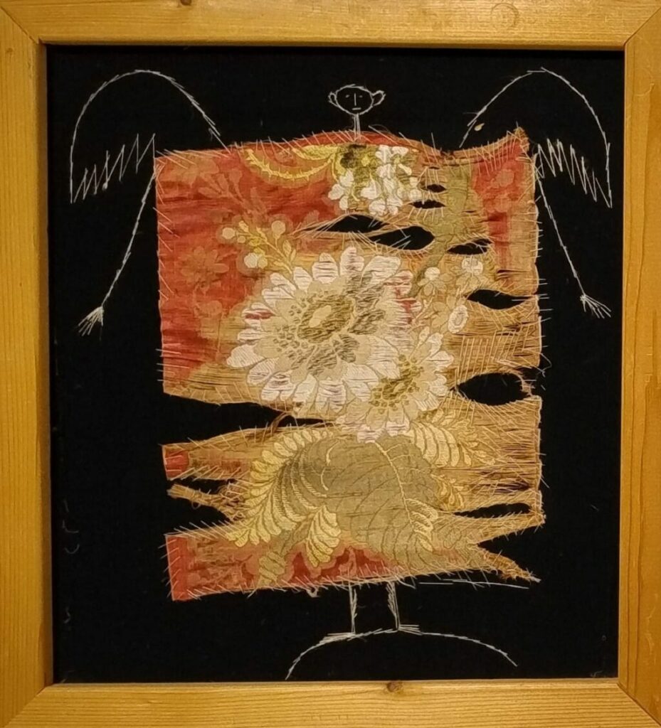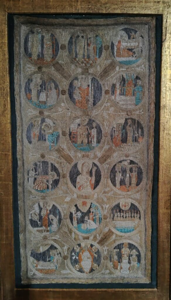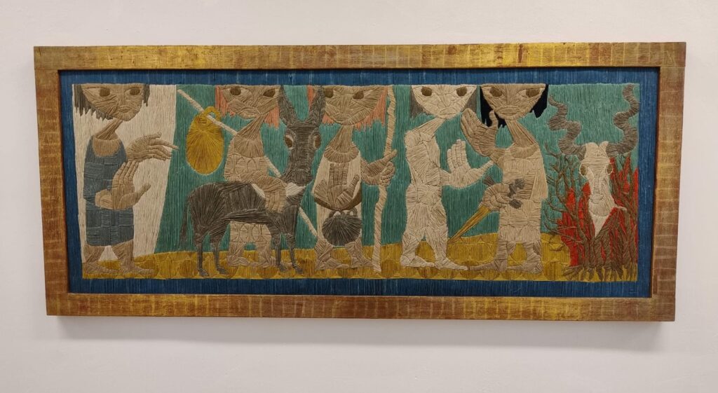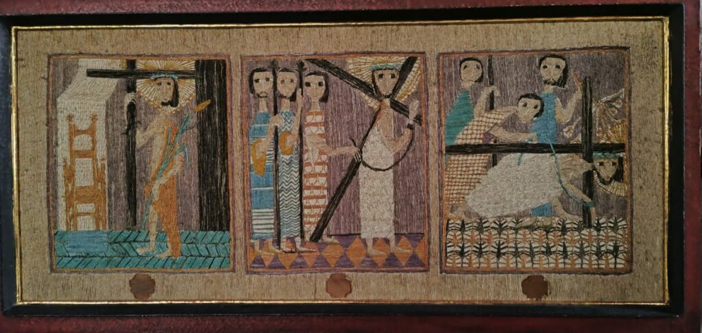 Als Gemeinschaftsarbeiten der beiden tief gläubigen Eltern entsteht in diesen frühen Jahren Außergewöhnliches: Szenen aus dem Alten und Neuen Testament als aufwändige Stickereien mit gefärbtem Hanfgarn. Als der Pfarrer der Sigmaringer Fidelis-Gemeinde 1963 zum Taufgespräch ins Haus kommt, erwirbt er für seine eben erst fertiggestellte Kirche spontan einen Teppich mit den Rosenkranzgeheimnissen. Bald gibt die Pfarrgemeinde neue Ausstattungsstücke für St. Fidels in Auftrag, so etwa eine Madonna aus Terracotta und einen ebenfalls gestickten Kreuzweg. Die Saulgauer Ausstellung beginnt mit einigen Beispielen aus dieser Werkgruppe. Arbeiten wie etwa „Brennender Dornbusch“ bleiben stilistisch in der Schwebe zwischen einer heiteren, naïven Tonlage und einer Strenge, die an die Malerei der Romanik erinnert.