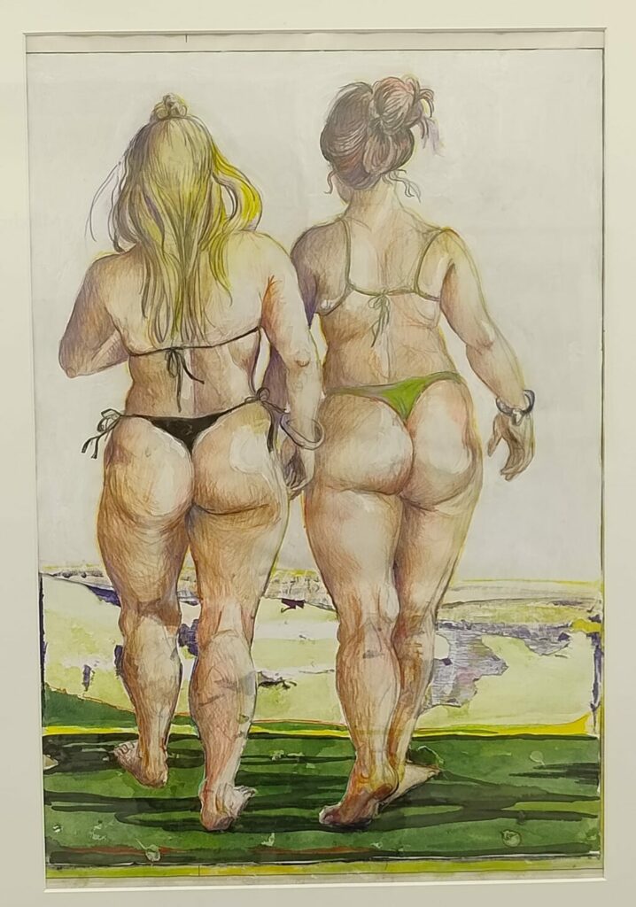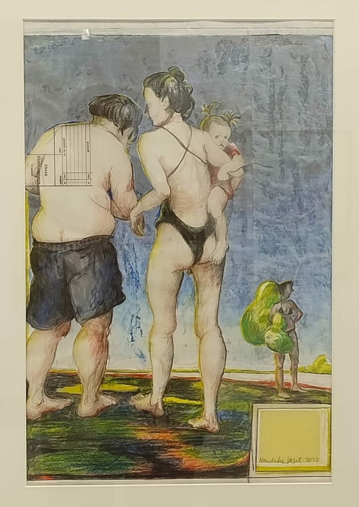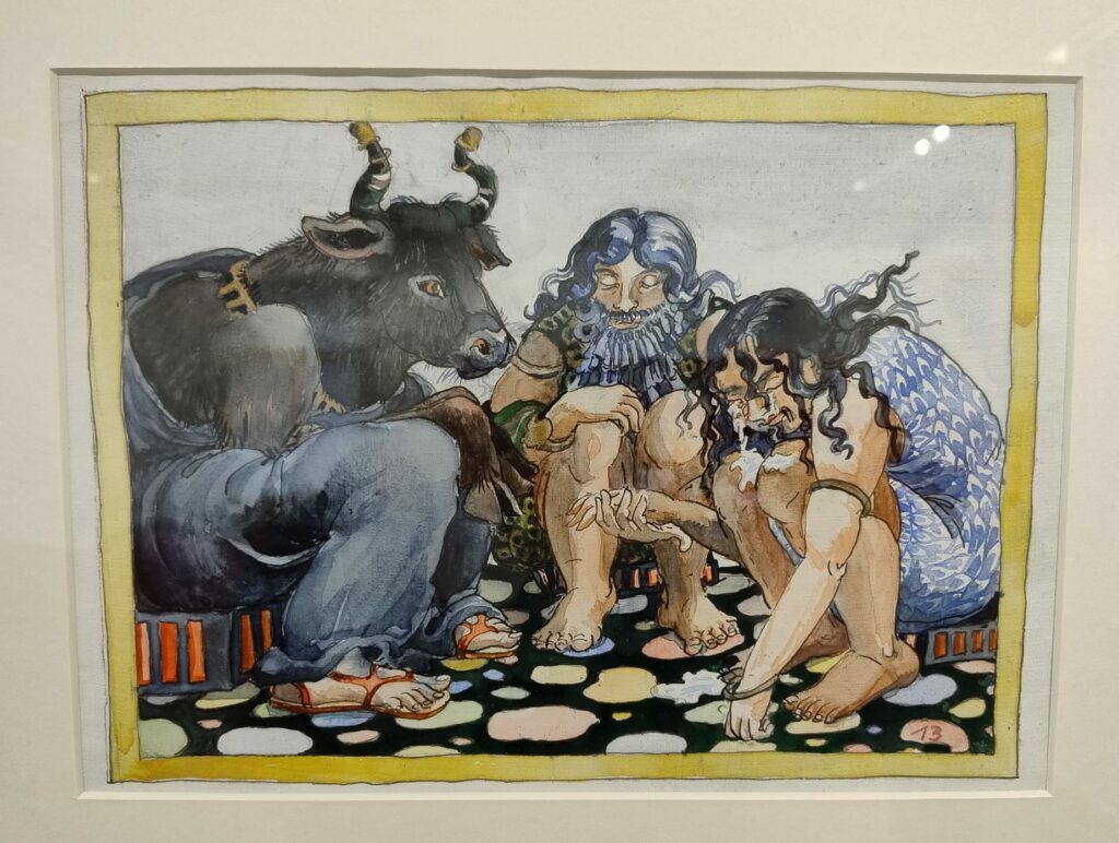 Tochter Hendrike, die seit über 30 Jahren in Saulgau-Fulgenstadt lebt, studiert an der Stuttgarter Kunstakademie, unter anderem bei Moritz Baumgartl und Wolfgang Gäfgen. Sie ist eine genaue Beobachterin von alltäglichen Gegenständen und von alltäglichen Situationen und hält diese meist in aquarellierten Tuschezeichnungen fest. In den wunderbar passenden Blättern – Andreas Ruess nennt Hendrike Kösel eine geborene Illustratorin – zum Grimmschen Märchen von der Blut- und der Leberwurst werden Alltagsgegenstände ins Fantastische verfremdet. In ihren Szenen vom Baggersee oder aus der Saulgauer Fasnet wird dann häufig ein ironisch-distanzierter Blick deutlich. Die Ausstellung zeigt schließlich auch einen Teil ihres zeichnerischen Hauptwerks, den 80-teiligen Zyklus von Zeichnungen zum altorientalischen Gilgamesch-Epos. In einem humorvollen, warmherzigen Ton, der an Comics oder Graphic Novels erinnert, erzählt sie sehr originell die berühmte Geschichte des legendären Königs von Uruk.