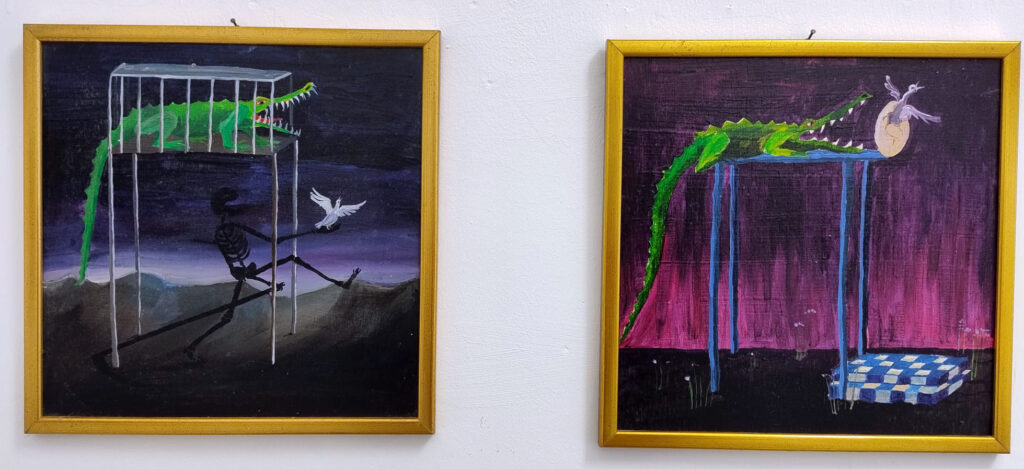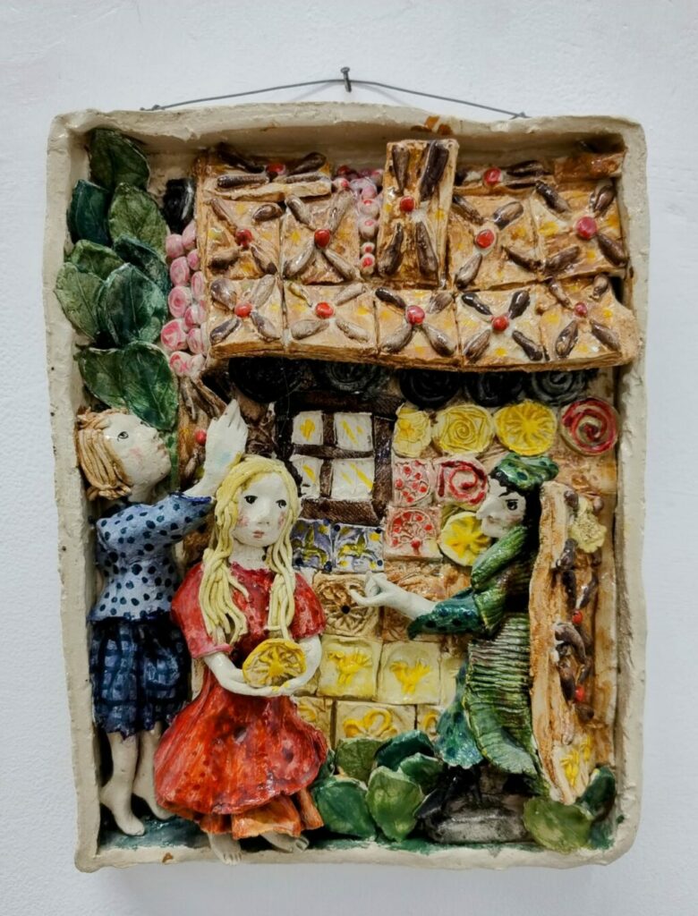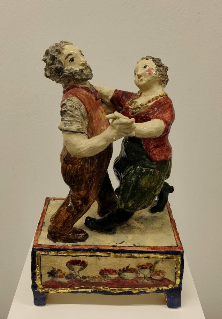 Judith Kösels Metier ist dagegen vor allem die Keramik oder, wenn größere Objekte gefragt sind, auch die Betonplastik. Es ist ebenfalls meistens ein heiterer, spöttischer Ton, der viele ihrer buntfarbigen, zumindest auf den ersten Blick eher verspielten Reliefs und Figurengruppen auszeichnet. So etwa, wenn sie das Gedrängel am Ertinger Baggersee oder die Gepflogenheiten in der Sauna aufs Korn nimmt. Manchmal wird es aber ausgesprochen politisch oder auch sehr ernst. So hat sie zum Beispiel in der ihr eigenen vielfarbigen Bildsprache ein ergreifendes kleines Epitaph, ein Gedächtnismal, für ihre Eltern geschaffen. Umgeben von den Dingen, die ihnen wichtig waren, liegen sie nebeneinander auf dem Totenbett: Er mit Esel, Wanderstock und Bienenwabe, sie mit ihren Porträts und Engel-Darstellungen. Die Auseinandersetzung mit Krankheit und Tod ist auch Thema ihrer Bildserie „Das Krokodil und der Tod“. Angesichts einer bedrohlichen Erkrankung schuf Judith Kösel diese 29 kleinen Ölgemälde mit surrealistischen, den Betrachter durchaus verstörenden Rätselbildern.