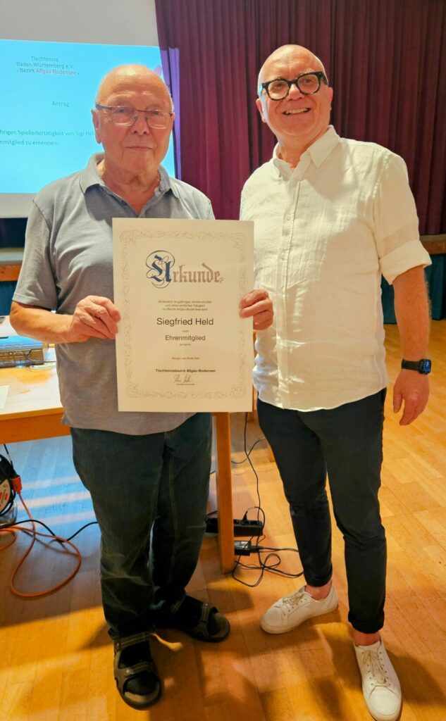 Zu guter Letzt ehrte Klaus Mahle ein Urgestein der TT Szene aus Wangen, Sigi Held, für 37 Jahre Spielleitertätigkeit mit einer Urkunde und einem Präsent.