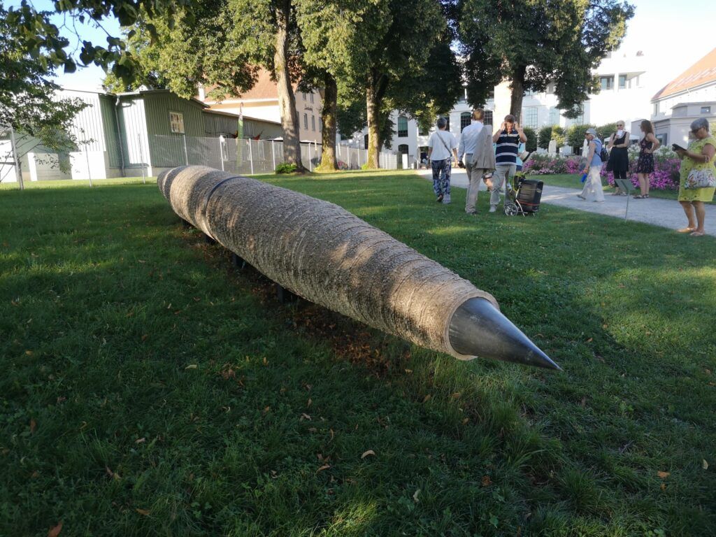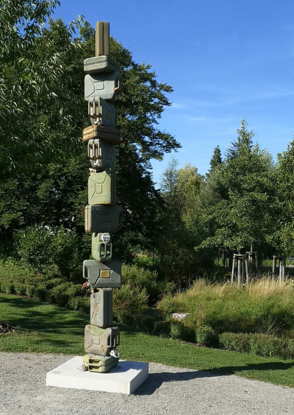 „Große Figur mit Gesicht“ heißt wenig weiter Friedemann Grieshabers hoch aufragende Arbeit, die etwas von einer Kultfigur aus fernen Zeiten hat. Der Künstler erläutert, dass für ihn die Verwendung des ganz und gar un-klassischen Materials Beton und eine eben bewusst nicht-naturalistische Auffassung der menschlichen Figur zwingend zusammengehören. Auch Guido Weggenmanns „Tanksäule“ sieht aus der Ferne wie ein Kultobjekt aus, nämlich wie ein Totem- oder Marterpfahl der nordamerikanischen Indianer. Tritt man näher, erkennt man, dass hier stählerne Wasserkanister zusammengefügt wurden. Nach Auskunft des Künstlers wurden sie von der Bundeswehr in Nordafrika verwendet und sollen hier nun auf die Gefährdung der Ressource Wasser verweisen.
