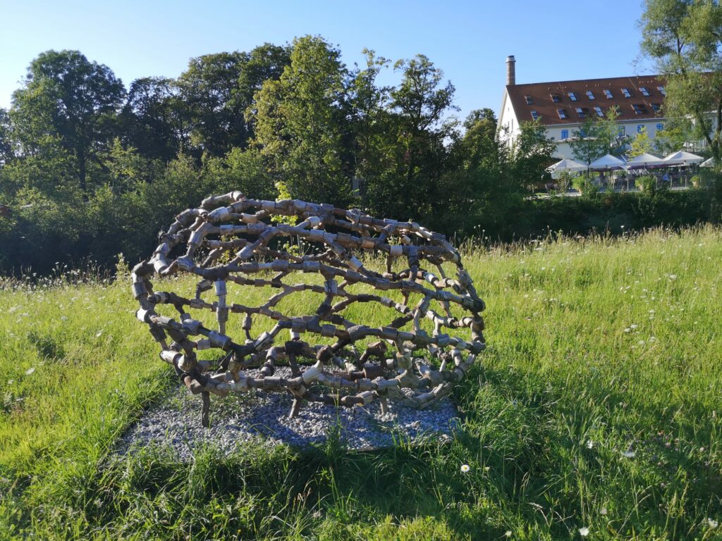 Irene Wanner-Mitter hat sechs mächtige Balken aus einem 300 Jahre alten Bauernhaus aufgerichtet, die sie zusammen mit einer Stele zeigt, die mit den für die Künstlerin typischen Formen bemalt ist. Alexander Habisreutinger aus Weingarten berichtet von einem Experiment. Erstmals hat er sich mit einem seiner fragilen hölzernen Gespinsten nach draußen gewagt. Seine luftigen, aus Hölzern von unterschiedlichem Durchmesser quasi geflochtenen Skulpturen kennt man bisher nur aus der Präsentation in Galerieräumen. Nun hat er an der Argen Äste und Fundholz gesammelt, alles getrocknet und zurecht gesägt und schließlich zu einem Objekt zusammengefügt, das er „Modulares Astgeflecht“ nennt. Und nun beobachtet er erstaunt, wie Wind und Wetter gewissermaßen an seiner Skulptur weiterarbeiten.