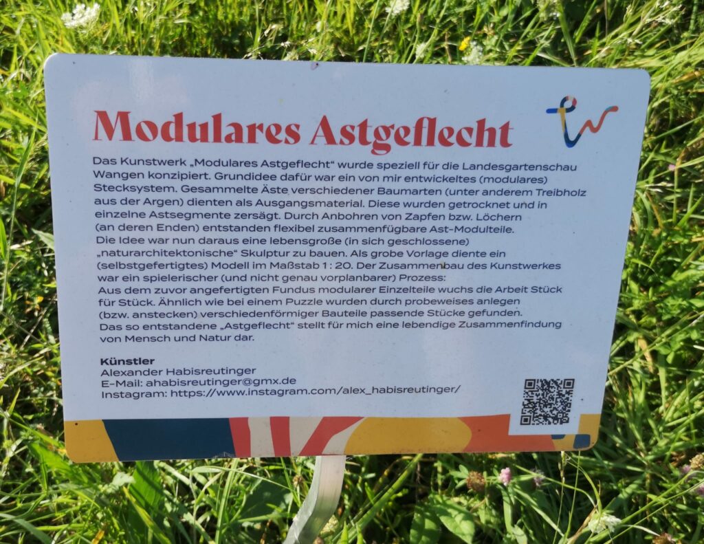 Mit Hilfe des Faltblatts „Garten der Künste“ kann man sich gut auf eigene Faust auf den Weg durch diese Freiluftgalerie innerhalb der Landesgartenschau machen. Bei den einzelnen Kunstwerken liefern dann kleine Texttafeln jeweils Informationen zu den Künstlern und ihren Überlegungen.