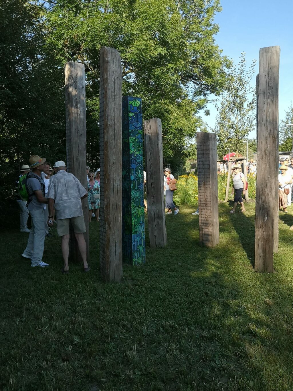 Wangen – Am letzten Dienstag (6.8.) herrschten auch am Spätnachmittag noch hochsommerliche und durchaus schweißtreibende Temperaturen. Trotzdem hatten sich über 100 bestens gelaunte Besucher eingefunden, um bei einem von Oberbürgermeister Michael Lang beschwingt moderierten Gang über das Gelände der Landesgartenschau die dort gezeigten Kunstwerke zu würdigen.