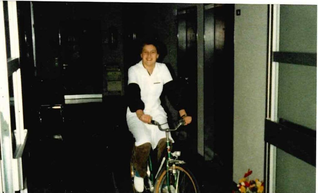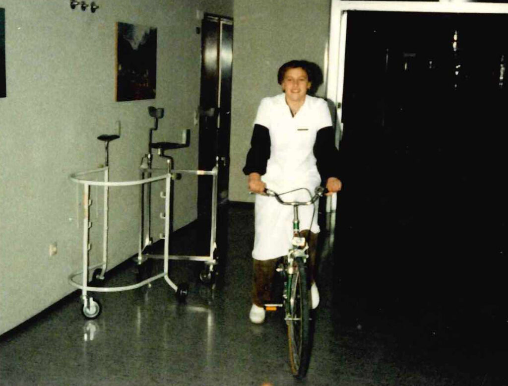 Zumindest erhält man diesen Eindruck, wenn sie ihren Bilderschatz aus 48 Jahren OSK offenlegt. Hier sieht man Kraus und ein paar Mitschwestern, wie sie lächelnd auf einem Drahtesel durch die Klinik radeln. Was hier lustig aussieht und wie eine Frühform von betrieblicher Gesundheitsförderung, entstand in Wahrheit eher aus der Not heraus, es war zweckdienlich. „Wir hatten im alten EK im Nachtdienst fünf Stationen, zu betreuen, A bis E, die alle hintereinander auf einer Geraden lagen, 200 Meter lang, und hatten deshalb Dienstfahrräder und Roller. Alle sind mit dem Rad über den Flur gefahren, selbst die Ordensschwestern aus Reute, die die Klinik damals führten. Das ging einfach schneller. Hätten wir das nicht getan, hätten unsere Beine irgendwann ihren Geist aufgegeben“, sagt Kraus, für die der Donnerstag (9.10.) der letzte offizielle Arbeitstag in ihrem Leben sein wird. Die Beine haben gehalten. Mit einem großen Fest wird sich die 64-Jährige in den Ruhestand verabschieden.
