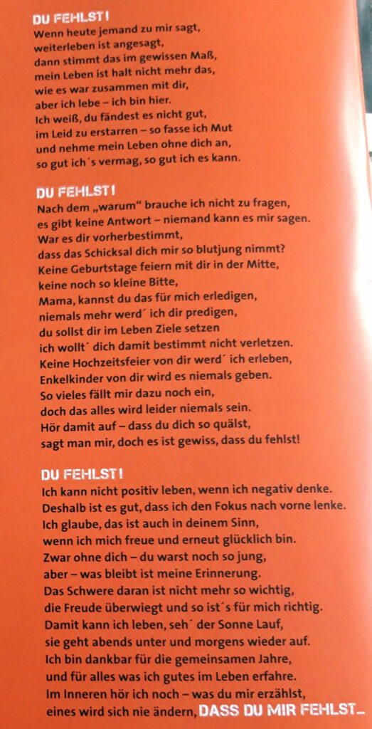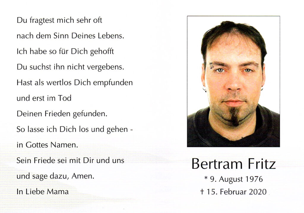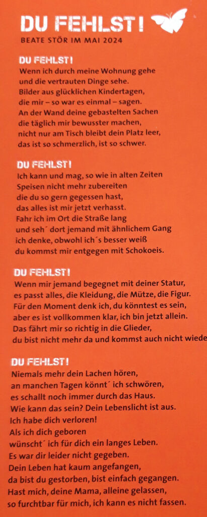 Leutkirch (rei) – 2227 Drogentote gab es nachweislich im Jahre 2023 in Deutschland. Die Dunkelziffer der nicht erfassten Drogentoten ist erheblich, sagt Beate Stör aus Leutkirch. Seit Jahren wirkt sie aufklärend und warnend. Der Anlass ihres so großen Engagements ist ein traurig-persönlicher: 2020 starb ihr Sohn Bertram an einer Überdosis Fentanyl, einem Opioid, das auch als Schmerzmittel im Gebrauch ist. Zum Drogen-Gedenktag am 21. Juli hat sie im „Drogenkurier“ ein Gedicht veröffentlicht, das wir hier in der Bildschirmzeitung nachpublizieren. Der „Drogenkurier“ wird herausgegeben von „jes“, einem Verband, der sich um Drogenabhängige kümmert. Den Nationalen Gedenktag für verstorbene Drogenabhängige gibt es seit 1998. Nachstehend das Gedicht von Beate Stör:
