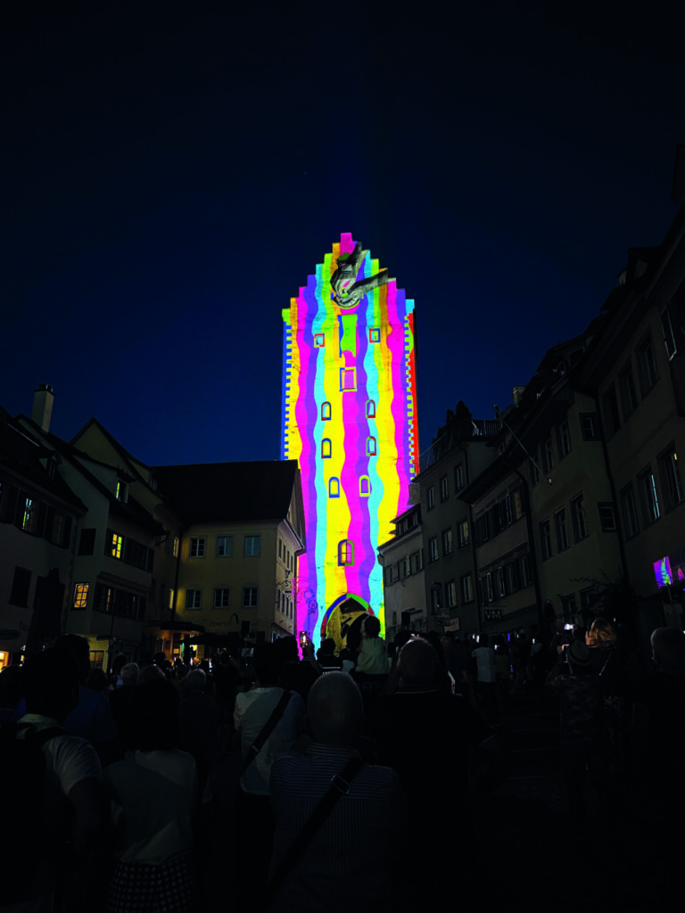 Das Obertor in Ravensburg, illuminiert aus Anlass der Langen Nacht der Museen in Ravensburg im August 2023. Foto: Marc Brandner