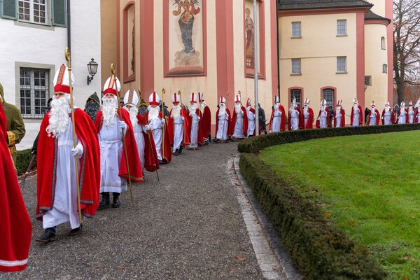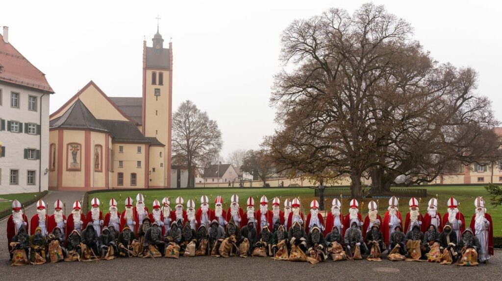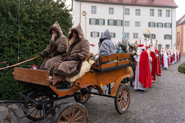 So verwundert es nicht, dass sich über die Jahrhunderte vielerorts die Obrigkeit darum bemühte, dem zügellosen Treiben der „Klosen“ einen Riegel vorzuschieben und alternative Traditionen zu etablieren – allerdings meistens mit recht wenig Erfolg. Eine bemerkenswerte Initiative gab es kurz nach dem Zweiten Weltkrieg in Altshausen. Ausdrücklich mit dem Ziel, dem „Klosentreiben“ ein Ende zu setzen bzw. es in zivilisiertere Bahnen zu lenken, wurde dort 1947 die Nikolausgilde gegründet. Sie besteht bis heute (https://nikolausgilde-altshausen.de) und ist mustergültig organisiert. Zu dieser im südwestdeutschen Raum, was Alter und Mitgliederzahl angeht, einzigartigen Vereinigung gehören derzeit 75 „gschtandene Mannsbilder“, wie es auf der Website heißt. Auch in diesem Jahre hat die Gilde wieder ein ziemliches Pensum zu bewältigen. Rund 130 Familien und rund 15 Kindergärten warten auf den Besuch der Paare von Nikolaus und Knecht Ruprecht.