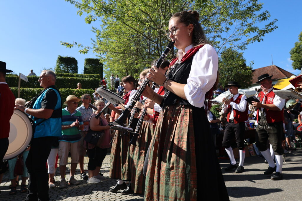 Fanfarenstöße eröffnen den Einzug der Dorfleute durch das obere Tor.