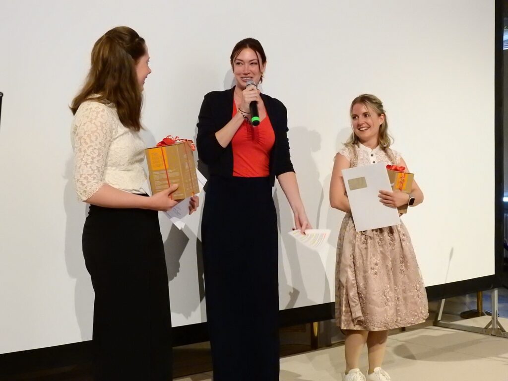 Die beiden Jahrgangsbesten mit der Note 1,3: Maylin Heinzmann (links) und Svenja Kotschi (rechts) sowie Moderatorin Stefanie Molitor (Mitte); Foto: RP Tübingen