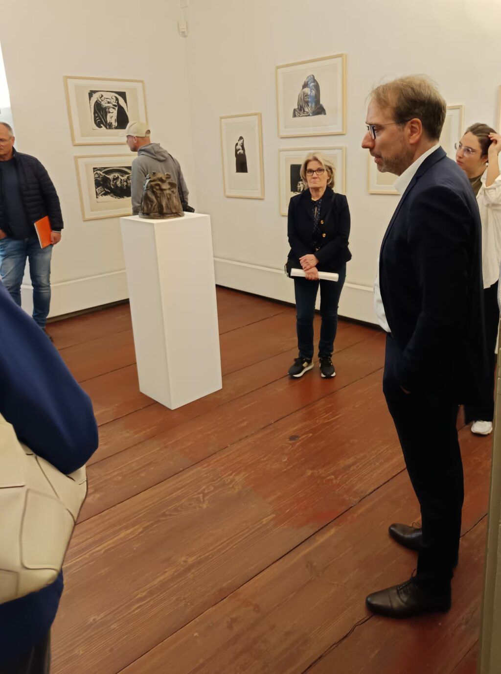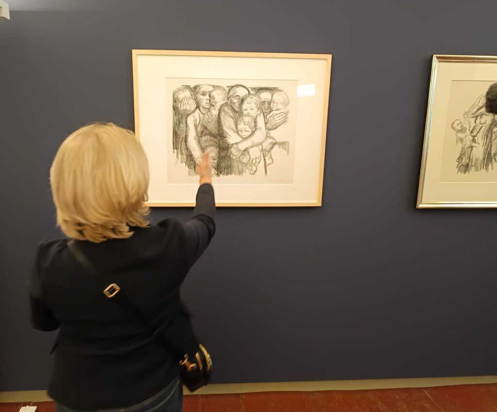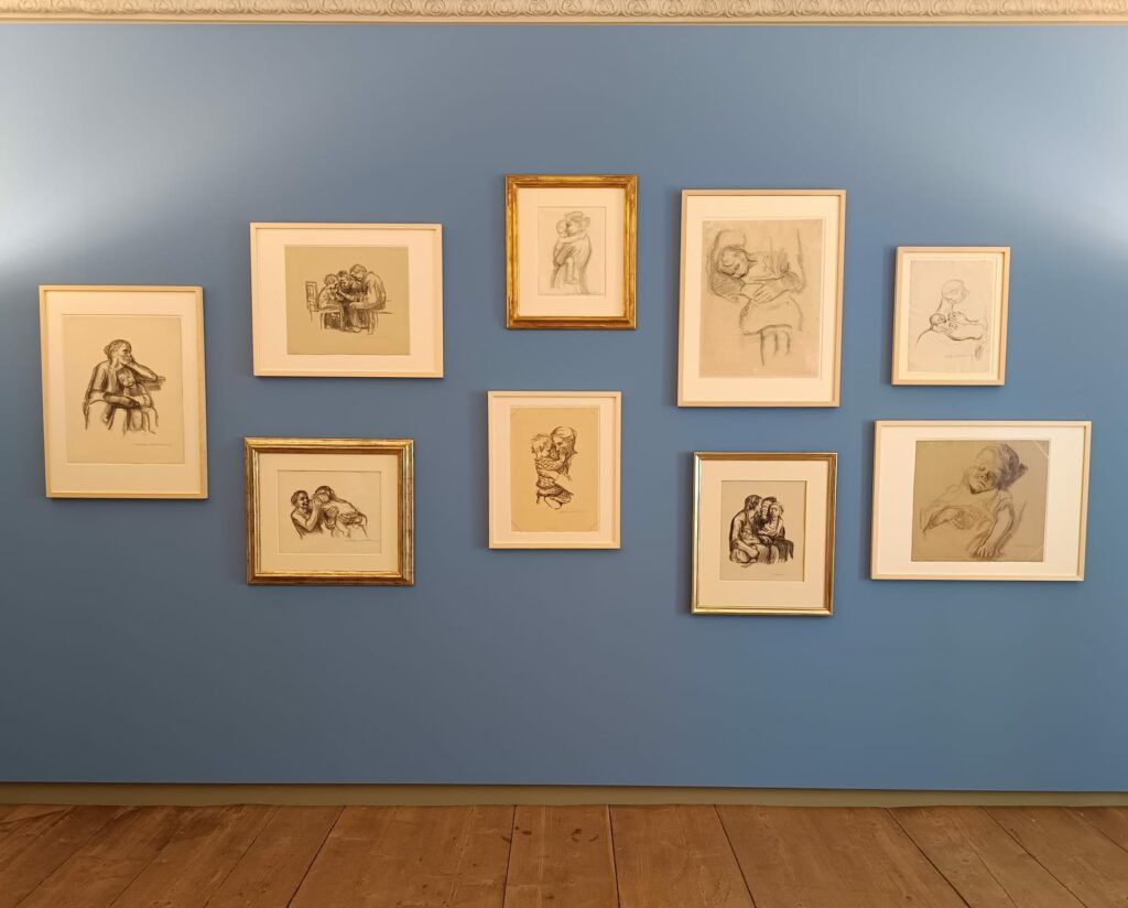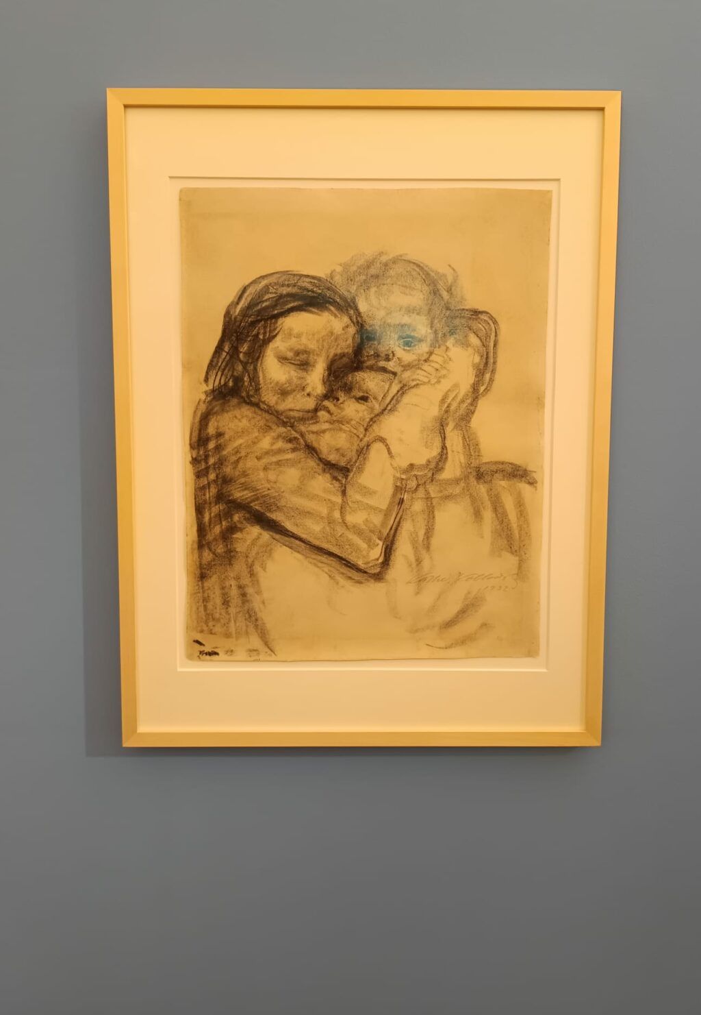 Beim Presserundgang erzählt Ute Kahl von ihren Anfängen als Sammlerin vor 30 Jahren. Als junge Mutter, eben zum vierten Mal schwanger, fühlt sie sich besonders von den Darstellungen von Müttern mit Kindern angesprochen. Und tatsächlich sind Mutter und Kind ein wichtiges Thema im Schaffen von Käthe Kollwitz, das sicher viel zu ihrer Popularität beiträgt und nun auch in Schloss Achberg eine große Rolle spielt. Die Künstlerin, selbst Mutter von zwei Söhnen, sieht Mutterschaft als ganz grundlegende Erfahrung, sowohl in der zärtlichen Fürsorge der Mütter als auch in deren Sorgen und Ängsten. Aus dem Erleben der lebensbedrohlichen Diphterie-Erkrankung von Sohn Hans entstehen mit den Zeichnungen „Abschied“ die vielleicht eindrücklichsten Arbeiten der Ausstellung.