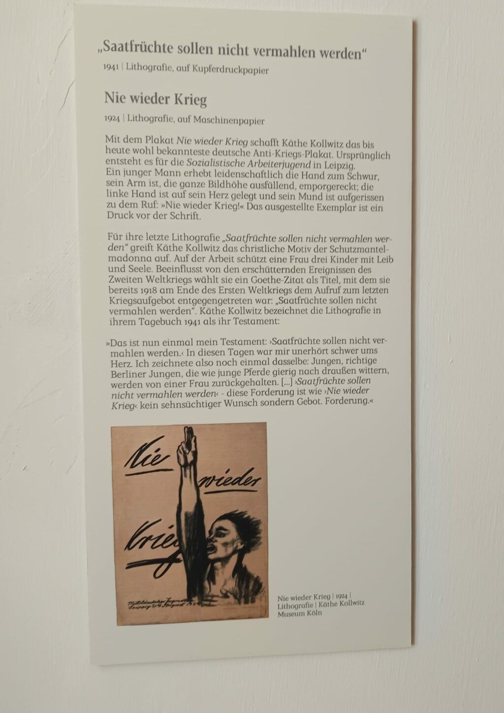 Das politische Engagement der Künstlerin führt dazu, dass sie in den 1920er-Jahren dann von verschiedensten fortschrittlichen oder sozialen Organisationen darum gebeten wird, Plakate für sie zu gestalten. Diesen Bitten kommt sie auch eifrig nach. Ihre ursprünglich in hohen Auflagen verbreiteten Plakate, aber auch ihre Serien, lassen sie natürlich auch ins Visier der Nationalsozialisten geraten, die ihr bald Leben und Arbeiten schwermachen. Die zum Beispiel für die Sozialistische Arbeiterjugend oder den internationalen Gewerkschaftsbund geschaffenen Plakate sind heute sicher die bekanntesten Werke von Käthe Kollwitz. Wer kennt nicht „Deutschlands Kinder hungern“ oder „Nie wieder Krieg!“, das dann in der frühen Bundesrepublik zu einem Schlüsselmotiv für die Initiativen gegen die Wiederbewaffnung werden sollte. Unzählige Male wurden und werden diese Motive der wenige Tage vor Kriegsende verstorbenen Künstlerin in unseren Geschichts- und Lesebüchern abgebildet.