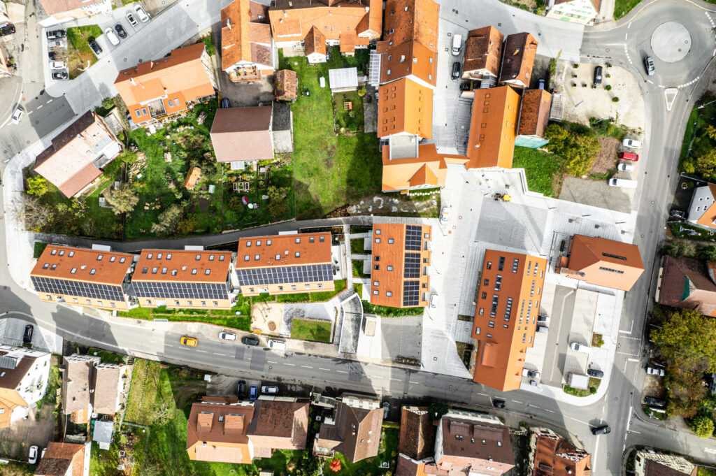 Gleichzeitig wurde auf der angrenzenden Brachfläche durch vier Neubauten Wohnraum mit insgesamt 27 Einheiten geschaffen. Unter den Neubauten wurde ein Erdsondenfeld realisiert und jedes der vier Dächer mit einer PV-Anlage ausgestattet. Weiter besitzt jedes Gebäude eine eigene Wärmepumpe, die aus dem gemeinsamen Erdsondenfeld gespeist wird und mit dem eigenen PV-Strom betrieben wird. Die dadurch gewonnene Energie versorgt nicht nur die Neubauten, sondern auch die angrenzenden historischen Gebäude. Somit war es erstmalig in Deutschland möglich, ein innerörtliches historisches Denkmalensemble mit erneuerbaren Energien dezentral vor Ort emissionsfrei zu versorgen.