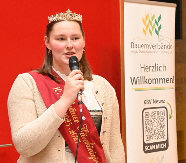 Im Anschluss richtete die frisch gekürte Käsekönigin Hannah Sust (Bild) einige Grußworte an die Versammlung. Es folgte der Rechenschaftsbericht von Stefan Loderer, der in einer umfangreichen Auflistung die vielfältigen Leistungen und Aktivitäten des Verbands darstellte.