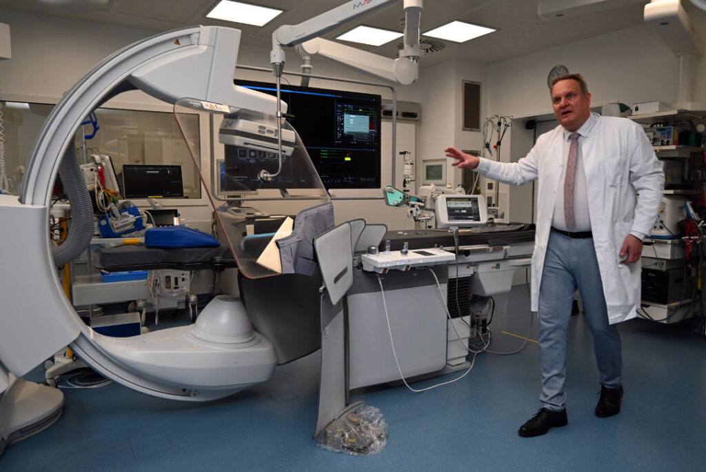 Prof. Florian Seeger (Bild) erläuterte die Anwendungen der Herzkathetermessplätze. Die Zahlen sind beeindruckend. Insgesamt ca. 1800 Herzkatheter-Untersuchungen werden an der OSK-Klinik in Ravensburg im Jahr durchgeführt. Täglich kommen zwei Patienten mit einem akuten Herzinfarkt in die Klinik und werden sofort versorgt. Mit dem neuen Messplatz verfügt die OSK jetzt über zwei Plätze und kann eine 24-Stunden-Versorgung an sieben Tagen in der Woche das ganze Jahr über vorhalten. Damit gehört die OSK zu den wichtigen Herzzentren in Deutschland.
