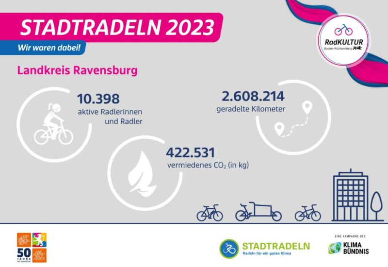 Alle Informationen zur Aktion und die Ergebnisse sind unter https://www.stadtradeln.de/landkreis-ravensburg/ veröffentlicht. Im Rahmen der Initiative RadKULTUR des Verkehrsministeriums Baden-Württemberg fördert das Land die Teilnahme an der Aktion.
