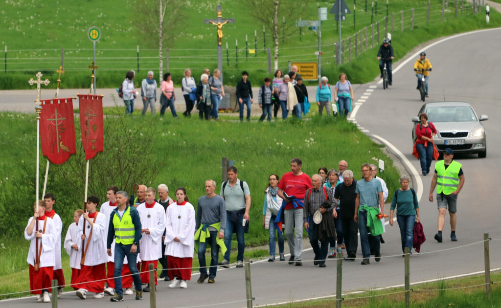 Sternwallfahrt 2023: Wie heuer – am 12. Mai 2024 – hat es im Mai 2023 eine Sternwallfahrt aus den umliegenden Pfarrorten nach Rötsee gegeben. Unser Bild zeigt im Vordergrund die Arnacher Gruppe unter Führung von Pfarrer Patrick Meschenmoser (verdeckt). Foto: Stephan Wiltsche