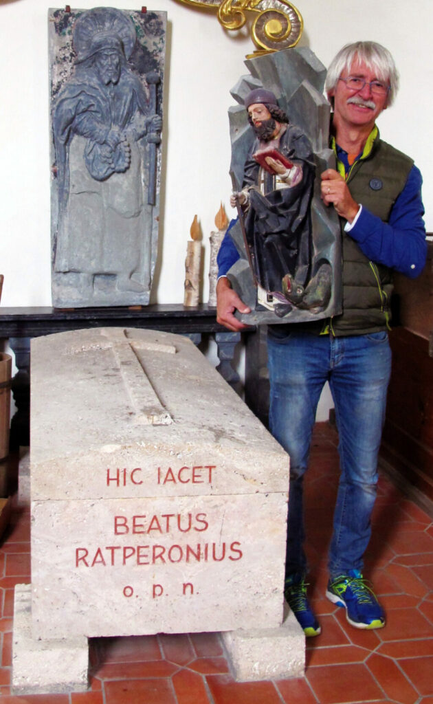 Magnus besucht Ratperonius: Im Jahre 2016 wurde die Rötseer Kirche restauriert und zwecks Schädlingsbekämpfung begast. Die Kapellengemeinschaft Brugg (bei Arnach) durfte ihre wurmstichige Magnus-Figur im hermetisch abgeschlossenen Kircheninneren dazustellen. Unser Bild zeigt den Architekten Franz Kussauer mit der Brugger Figur am Sarkophag von Ratperonius. Wie der Selige von Rötsee hat auch der Allgäu-Heilige Magnus einen starken Regionalbezug und wird vielerorts in Oberschwaben und im Allgäu besonders verehrt. Foto: Gerhard Reischmann