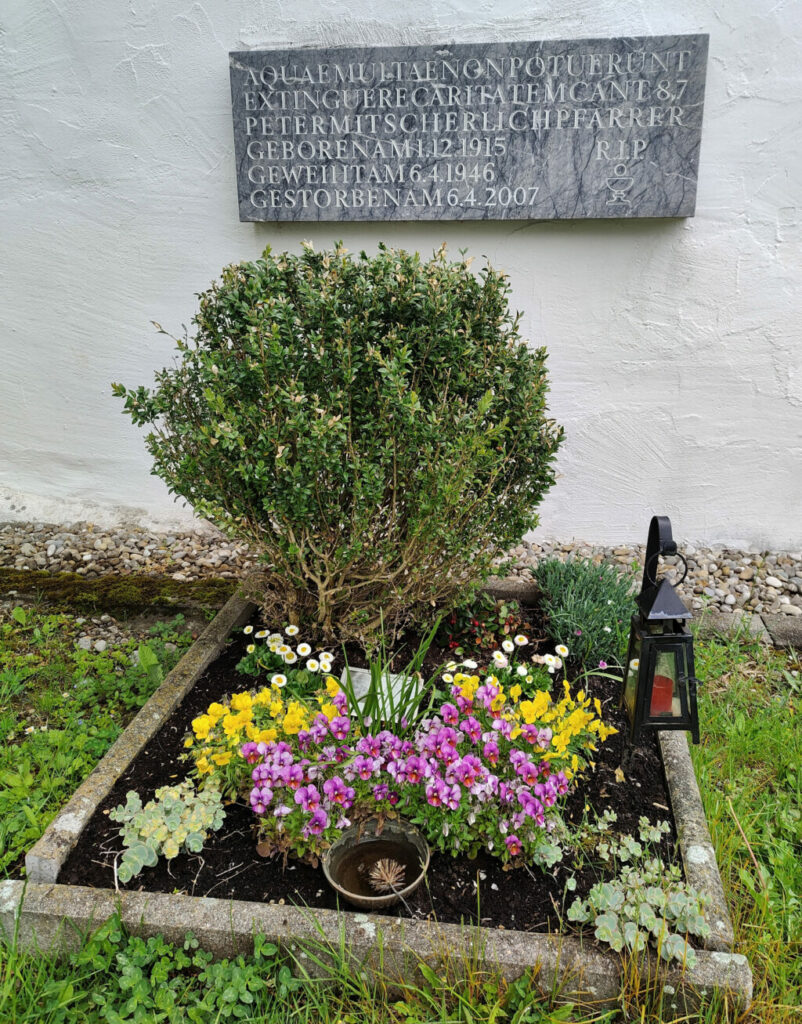 Grab von Pfarrer Peter Mitscherlich an der Kirchenmauer. Der charismatische und predigtstarke Priester – ein Konvertit – machte Rötsee in den 1980er- und 1990-Jahren zu einem religiösen Anziehungspunkt. Foto: Bernhard Müller