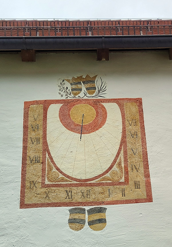 Bei der vorletzten Renovierung der Kirche 1994 wurde auch die Sonnenuhr (Bild: Bernhard Müller) an der äußeren rechten Seitenwand der Kirche aus dem Jahr 1698 wieder freigelegt. Sie erinnert uns wiederum an Ratperonius, für den die weltlichen Schätze, um deretwillen sich die Menschen schlagen und erschlagen, nur den Glanz des falschen Goldes tragen. Er ließ sich davon nicht blenden und erkannte, dass diese Schätze nicht wertvoller sind als morsches Holz und Veitstänze um die Narretei. Aus seinem zeitlosen Blickwinkel heraus vergeht und zerrinnt doch alles wieder in wenigen Augenblicken. Rötsees Sonnenuhr an der Grabeskirche des seligen Ratperonius weist uns hin auf die ewige Zeitlosigkeit unseres Schöpfers und die frühe Zeit des Christentums in unserer Heimat.