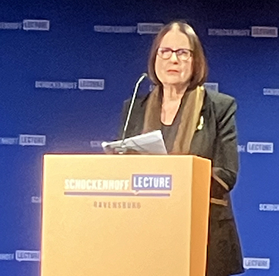 Dr. Scherbakowa beschrieb in ihrer Rede im besten Deutsch ihre sehr persönliche Beziehung zu Andreas Schockenhoff, die schon vor der Annexion der Krim 2014 von einer übereinstimmenden Einschätzung des „Systems Putin“ geprägt war. Schockenhoffs Engagement für die russische und ukrainische Zivilgesellschaft sei visionär gewesen, geradezu zeitlos, wenn man die heutige Situation anschaue. Für einen dauerhaften Frieden zwischen Russland und der Ukraine hatte sie eine pessimistische Einschätzung. „Putin kämpft gegen Humanismus, gegen demokratische Werte und für eine russische Hegemonie“, waren ihre Worte.