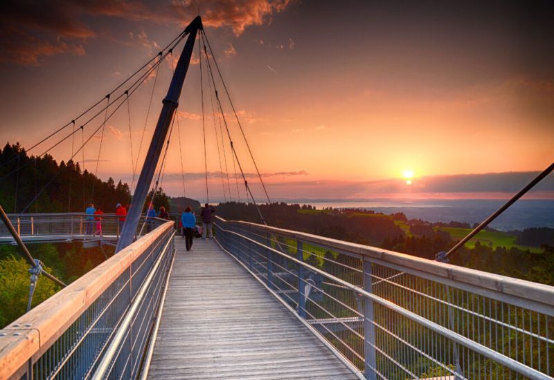 Auf dem Baumwipfelpfad warten derweil besonders imposante Ausblicke: „Die frisch gemähten Wiesen in Kombination mit den Schneeresten auf den Allgäuer Bergen bilden einen tollen Kontrast zum funkelnden Bodensee“, sagt Alisa Schneider von der Waldwelt Skywalk Allgäu. Der Waldboden unter der Hängebrückenkonstruktion birgt zahlreiche Abenteuer. Das aktuelle Highlight: die klackernde Holzkugelbahn am Waldpfad.