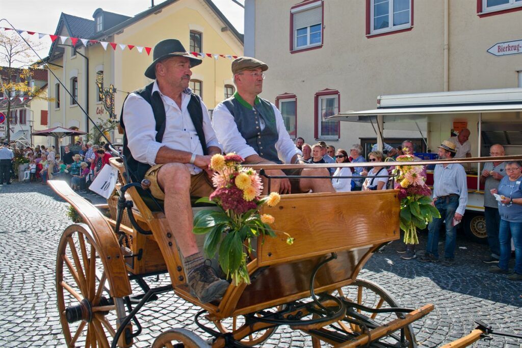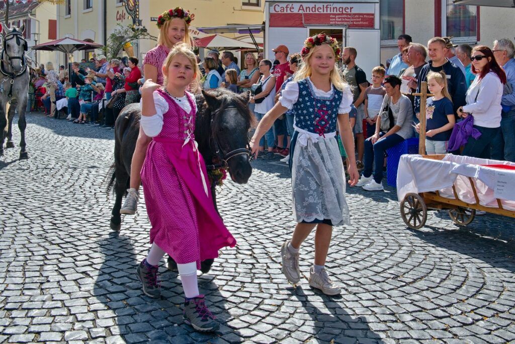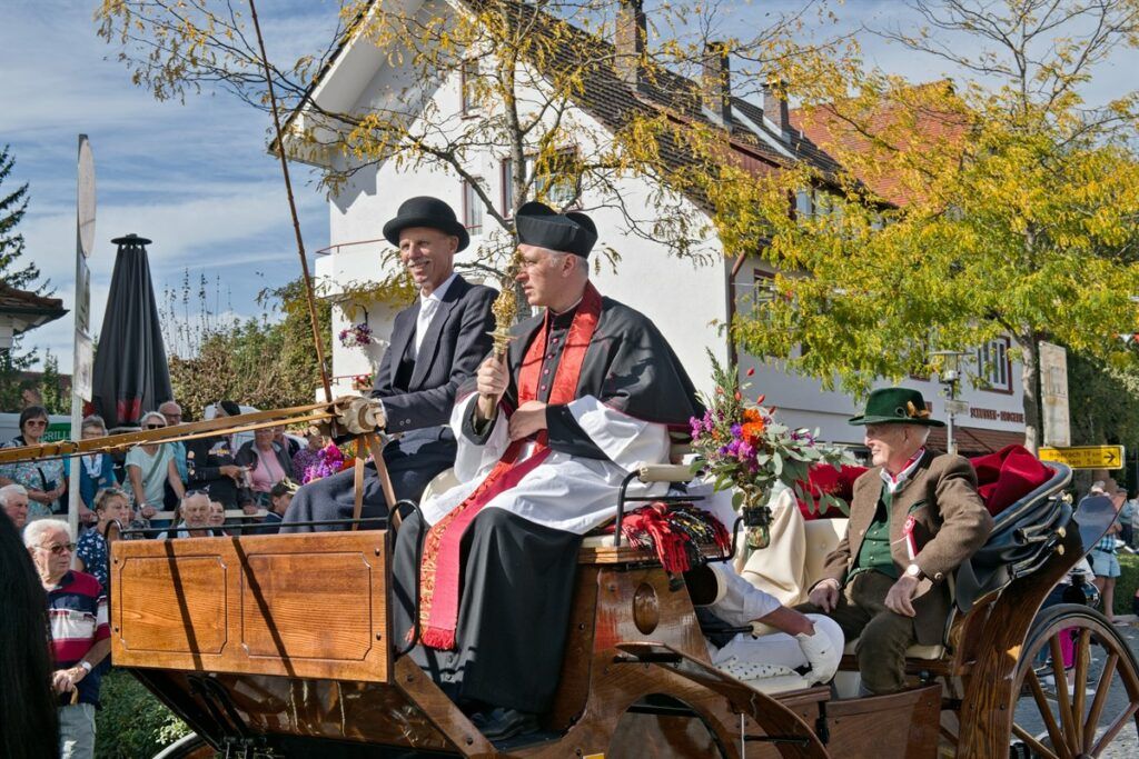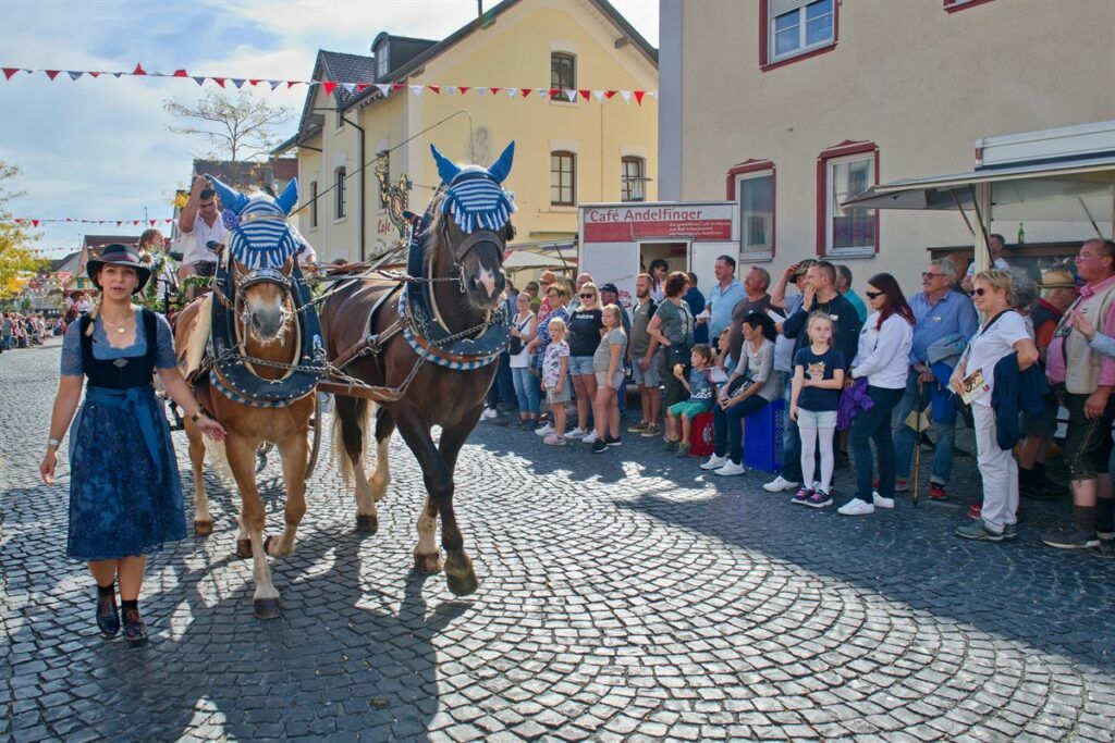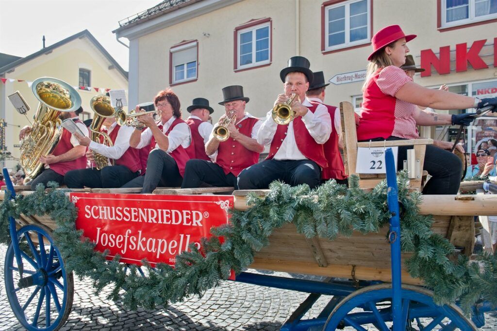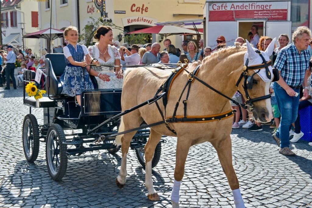 Historische Gespanne zeigten, wie Pferde und Ochsen im Einsatz waren in der Landwirtschaft. Heute Brauchtum, noch vor 50 Jahren alltägliche Arbeit. Man sah Wagen, mit Musikern geladen, die elegante Kutsche, den Hochzeitslader-Wagen, den Langholzwagen, die Jagdgesellschaft zu Pferde und die gelbe Postkutsche. Der imposante achtspännige Festwagen mit den Schussenrieder Bierfässern bildete den Schluss des Festumzuges