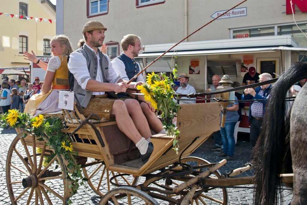 Vor dem Festzug begrüßte der Mitbegründer des Fuhrmannstags Franz Mayerföls die Gäste bei der Ehrentribüne vor dem Bierkrug-Museum. Der katholische Pfarrer Nicki Schaepen und seine evangelische Kollegin Susanne Richter baten um Gottes Segen für die Fuhrleute, ihre Pferde und ihre Tiere sowie alle anwesenden Menschen.