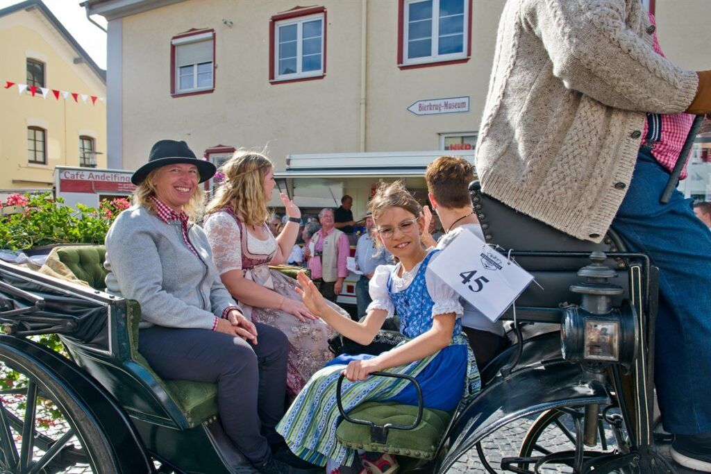 Auf der Ehrentribüne bei der Brauerei moderierte Wolfgang Mayerföls, der ebenfalls Fuhrmann ist, den Festzug mit launigen Kommentaren. Aus ihm sprudelte sein Wissen über Pferde, Fuhrleute und die Wagen wie ein Wasserfall heraus. Witzige Kommentare sorgten für Kurzweile und viel Heiterkeit bei Ehrengästen und den Zuschauern.