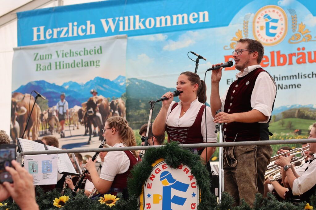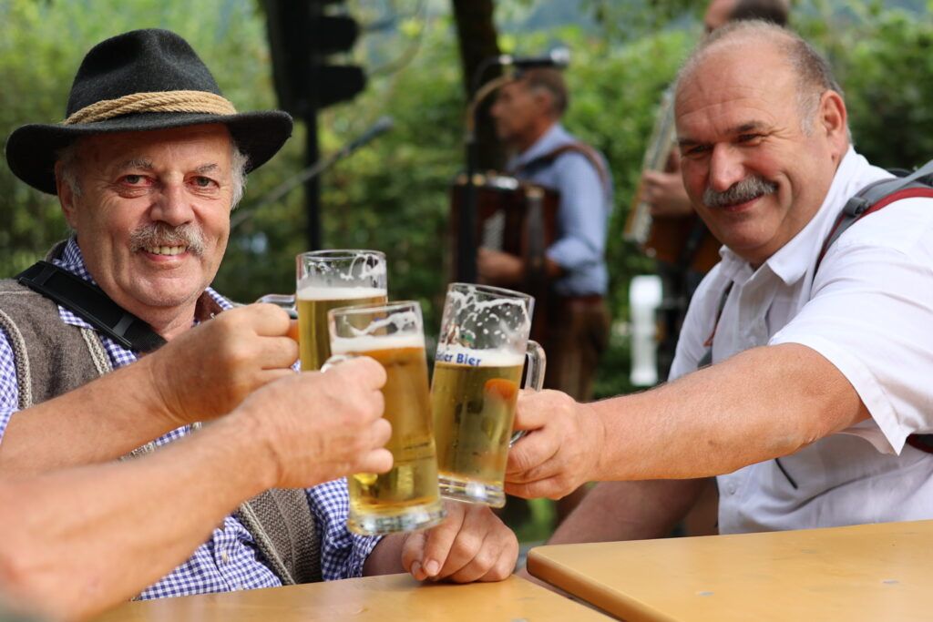 Am Garten der Oberen Mühle führte der Weg vorbei, das Bimmeln der Schellen kündigte die Herden schon von weitem an. Dazu spielten Musiker von „Alpen-Starkstrom“ und die Gäste haben die Partystimmung bei Bier, Gesang und Krustenbraten genossen. Im Festzelt, das morgens schon vollbesetzt war, sind die Kässpätzle der Renner bei den Besuchern. Die heimische Musikkapelle spielte vom Franz und der Vogelwiese, die Kuschelpolka und ließ viel Schmalz und Herzschmerz in die „Böhmische Liebe“ fließen.