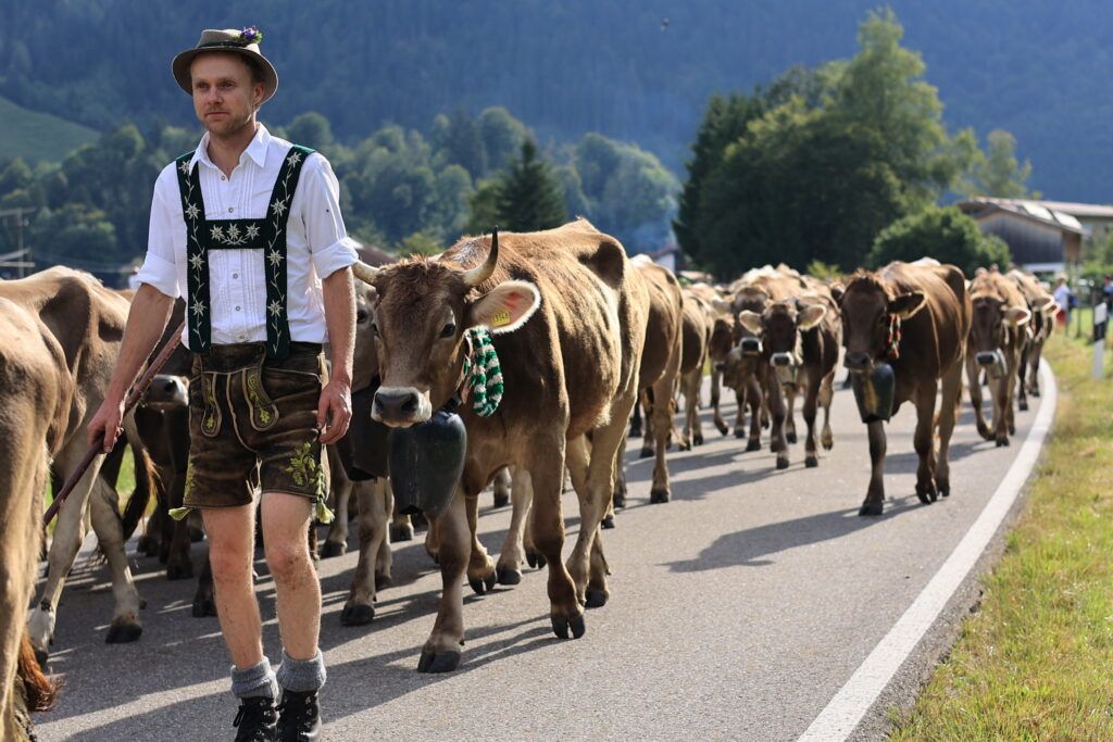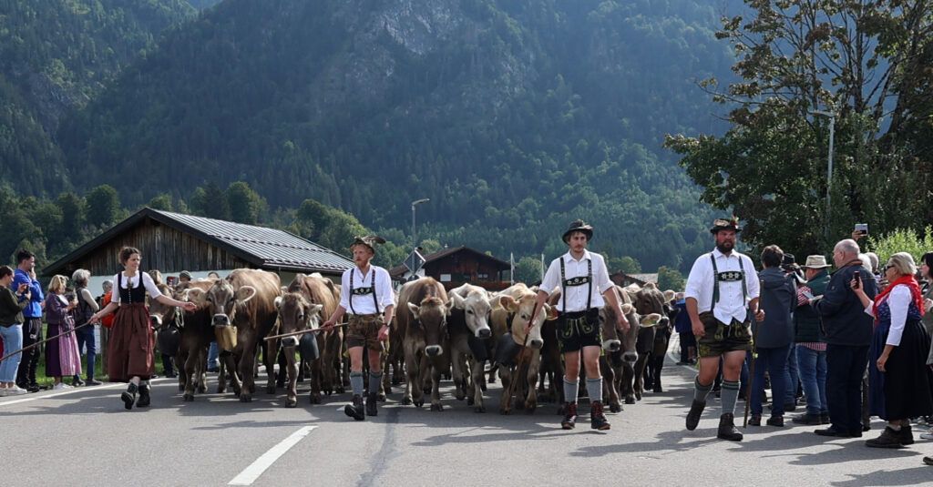 Bad Hindelang – Rund eintausend Jungrinder und ein Mehrfaches an Besuchern in Bad Hindelang haben mit dem Wetter Glück gehabt. Glück auch auf den fünf Alpen dort: Von jeder Alpe ist ein geschmücktes Kranzrind mitgekommen. Zur Erläuterung: Wenn das Rind an der Spitze des Zuges geschmückt ist, dann ist das das Zeichen dafür, dass der Alm-Sommer unfallfrei abgelaufen ist.