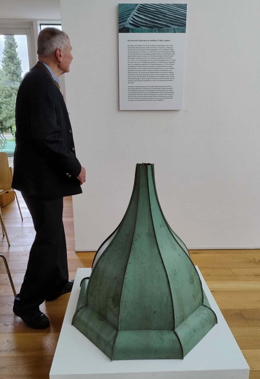 Unter dem Motto „In eigener Sache“ hat sich der Hausherr, wie er in seiner Eröffnungsrede berichtet, einen lange gehegten Wunsch erfüllt: eine Schau, die erzählt von der – so der Untertitel der Ausstellung – „Schönheit historischer Blecheindeckungen und deren Erhalt“. Mit der Restaurierung und Ertüchtigung von Blechdächern vor allem aus dem 18. und 19. Jahrhundert hat sich Wolfgang Huber längst überregional, ja international einen ausgezeichneten Ruf erarbeitet.