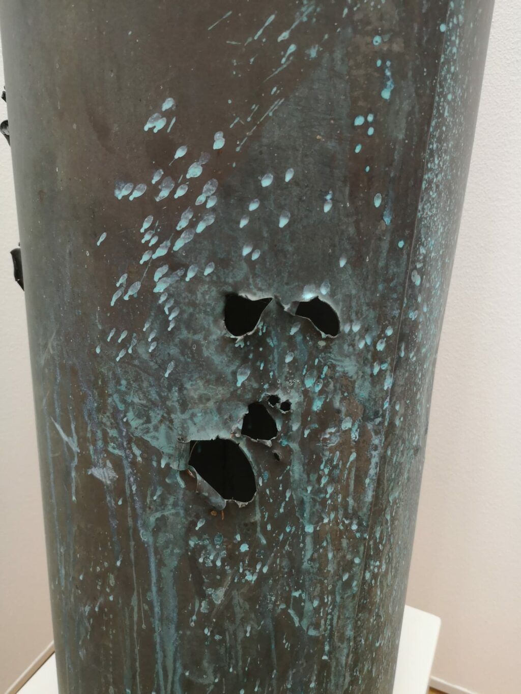 Von den historischen Blechdächern sind vor allem im 20. Jahrhundert viele verlorengegangen, entweder weil man ihre Bedeutung nicht erkannte oder weil eine Sanierung als zu kostspielig erschien. Der Erhaltung und fachgerechten Ertüchtigung der noch vorhandenen kommt daher eine besondere Bedeutung zu. Diesen Dächern und den dort verwendeten Blechen ist gewissermaßen auch Geschichte eingeschrieben, was in der Kißlegger Präsentation eindrucksvoll erlebbar wird: Überall finden sich die Spuren der handwerklichen Bearbeitung in Techniken, die in den Werkstätten weitergegeben wurden. Es finden sich außerdem die Spuren von Wind und Wetter, auch von größeren Wetterkatastrophen. Und es finden sich Spuren politscher Katastrophen wie etwa bei dem ausgestellten Stück von der Waldseer Pfarrkirche. In der Nachkriegszeit war es von französischen Besatzungssoldaten unter Beschuss genommen worden.