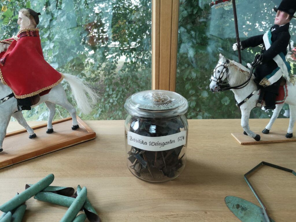 Der eigentliche Clou der Ausstellung sind aber die zahlreichen originalen Objekte: die Dachbleche mit ihrer malerischen Patina, die Kirchturmspitzen und Kirchturmkugeln, die Aufsätze und Zierknöpfe, selbst solche Kleinteile wie Rollnieten oder Nägel. Dinge also, die der Laie sonst nie von Nahem sieht. Diese Sachen seien ja eigentlich Ausschuss, erläutert die Tübinger Kunsthistorikerin und Restauratorin Dr. Julia Feldtkeller in ihrer Einführung in die Ausstellung. Es handelt sich also um Teile, die an den Dächern nicht weiterverwendet werden konnten, von Wolfgang Huber aber aufbewahrt wurden.