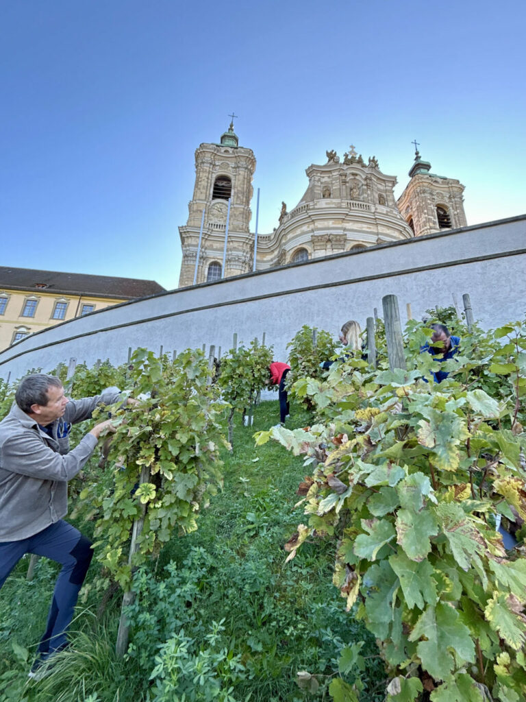 Ernte im Schatten der Basilika: An der Abteistraße werden die Trauben sorgfältig geschnitten und sortiert.