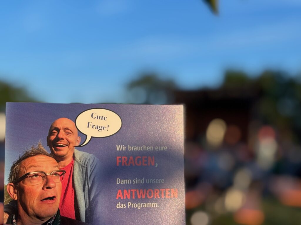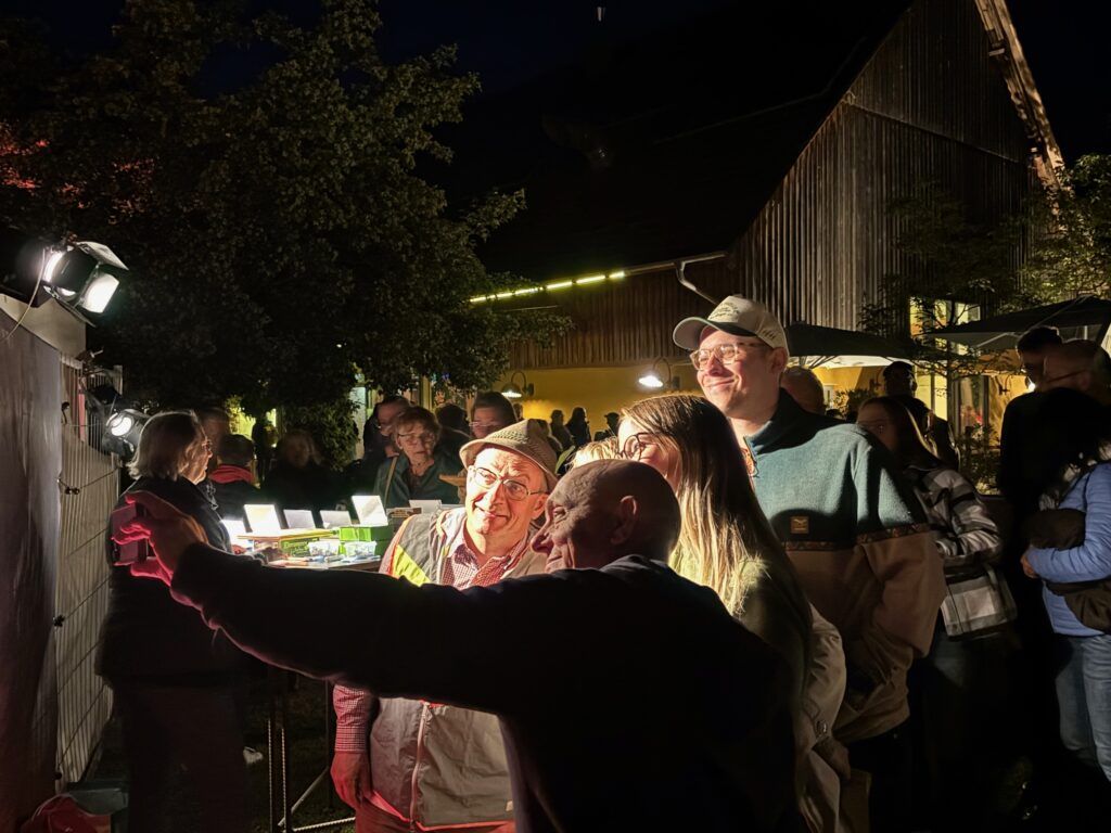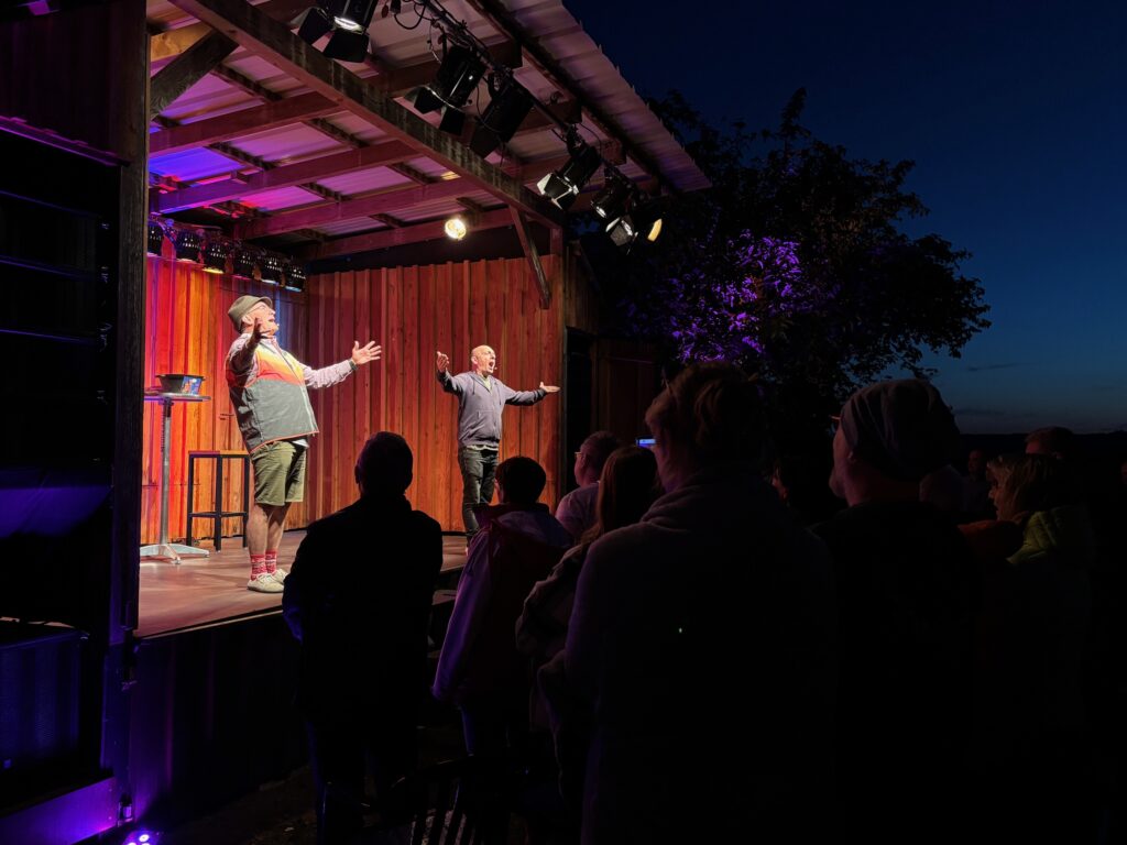 Die Veranstaltung neigt sich dem Ende zu. Zum Schluss singen Wigald Boning und Bernhard Hoëcker ein Lied, das sie seit vielen Jahren im Repertoire haben: die Nationalhymne von Liechtenstein. Das sitzt. Witzigkeit kennt nun mal keine Grenzen. Für Dieter und Danika aus Baindt und die vielen anderen Besucher geht’s nach der Bühnenshow direkt zum Buchverkaufsstand der Künstler und zum Glühweinstand der Gastgeber Uli Boettcher und Salka Böttcher. Ihr Fazit: „Das Hoftheater ist sehr schön. Wir waren bereits Anfang des Jahres hier, haben das Programm gesehen und direkt Schönwetterkarten für den heutigen Open-Air-Abend gekauft.“ Na wenn das nicht Lust auf Sommer und weitere Veranstaltungshighlights macht.