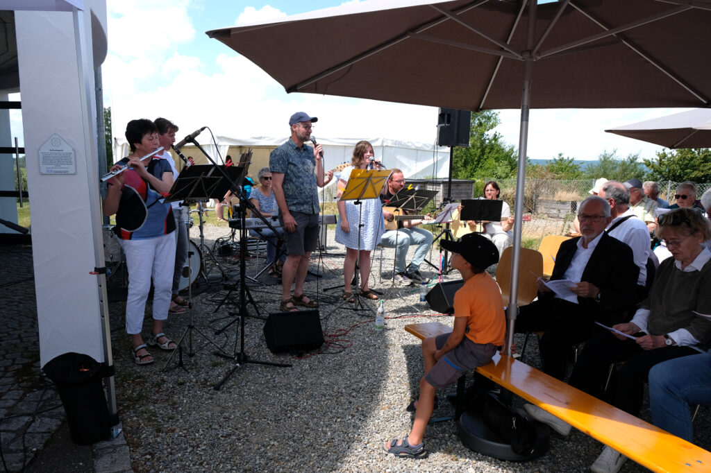 Die Plätze vor der Kapelle waren zum Gottesdienst alle belegt. Die Sonne strahlte und der Wind probte die Standfestigkeit der Sonnenschirme. OB Hans-Jörg Henle machte dabei eine praktische Erfahrung als Schirmherr. Er hielt tapfer einen Sonnenschutz, damit dieser während des Gottesdienstes nicht abhob. Die Kleinen vom Kindergarten St. Silvester animierten zum Mitsingen, und Amicitia, Alphornbläser sowie später die Steibisberger stemmten dann routiniert den musikalischen Teil.