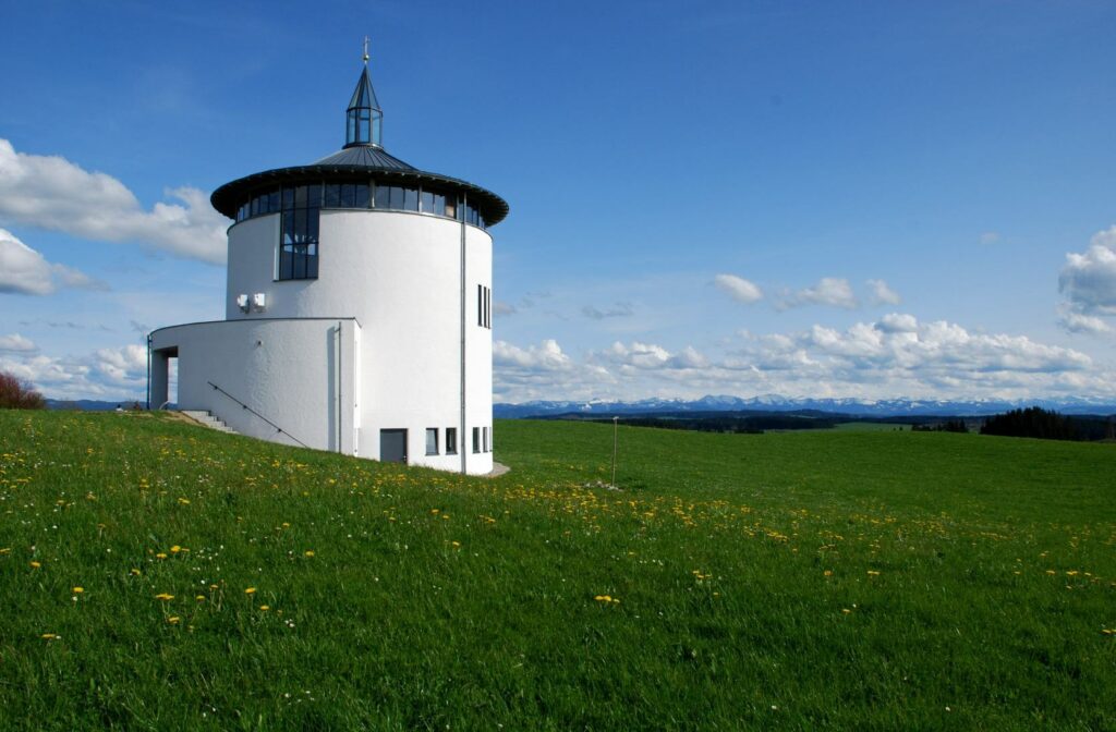 Ästhetischer Rundbau vor Alpenkulisse. Foto: Georg Zimmer