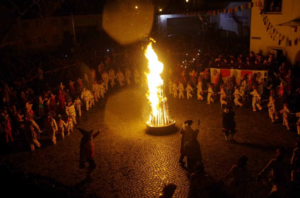 Der Tanz der Masken am Hexeneck unterhalb des Aulendorfer Schlosses ist der traditionelle Beginn der Ortsfasnet. Die erweckten Masken tanzen befreit zu den Klängen des Aulendorfer Narrenmarsches um das hoch auflodernde Feuer am Hexeneck, um danach hinauf zum Schloss zu ziehen.